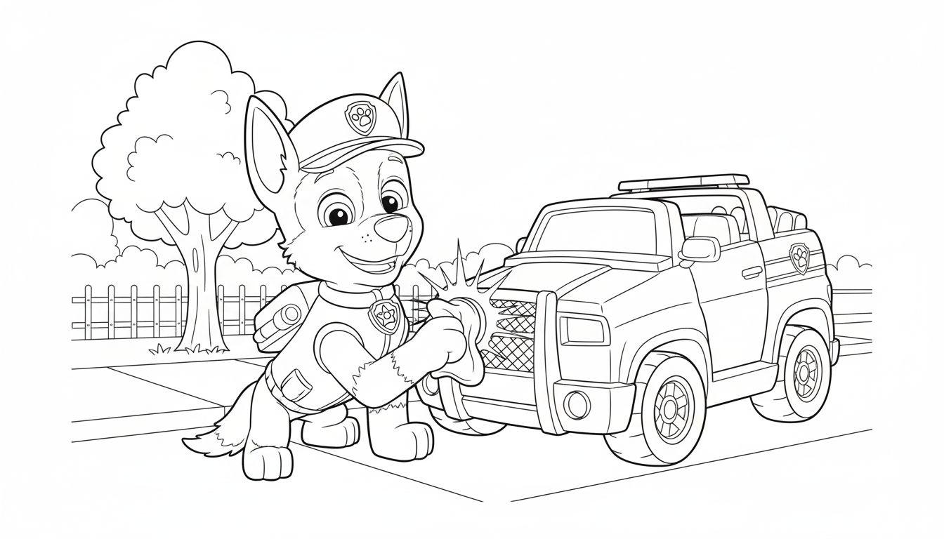 Paw Patrol Ausmalbild: Chase mit Polizeiauto – Kostenlose Malvorlage für Kinder
