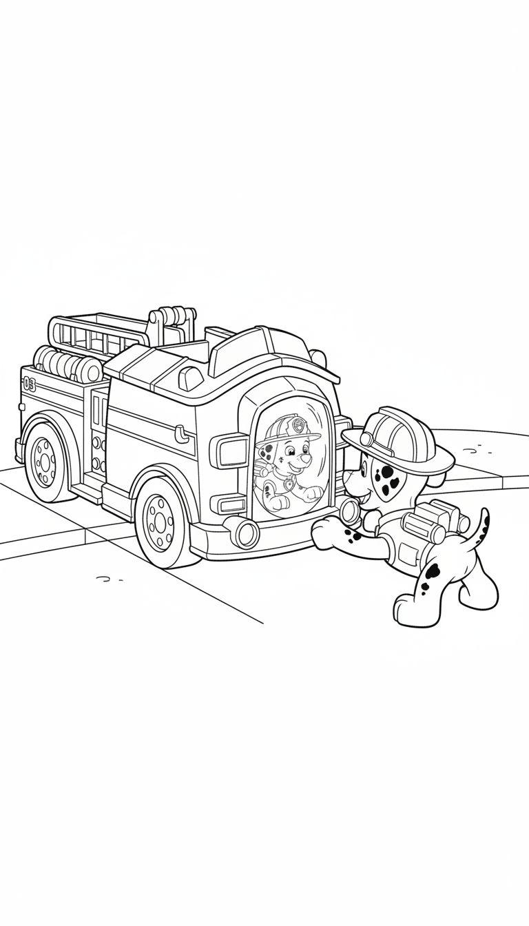 Marshall und seine Freunde auf großer Feuerwehrmission – Eine Ausmalseite für kleine Helden