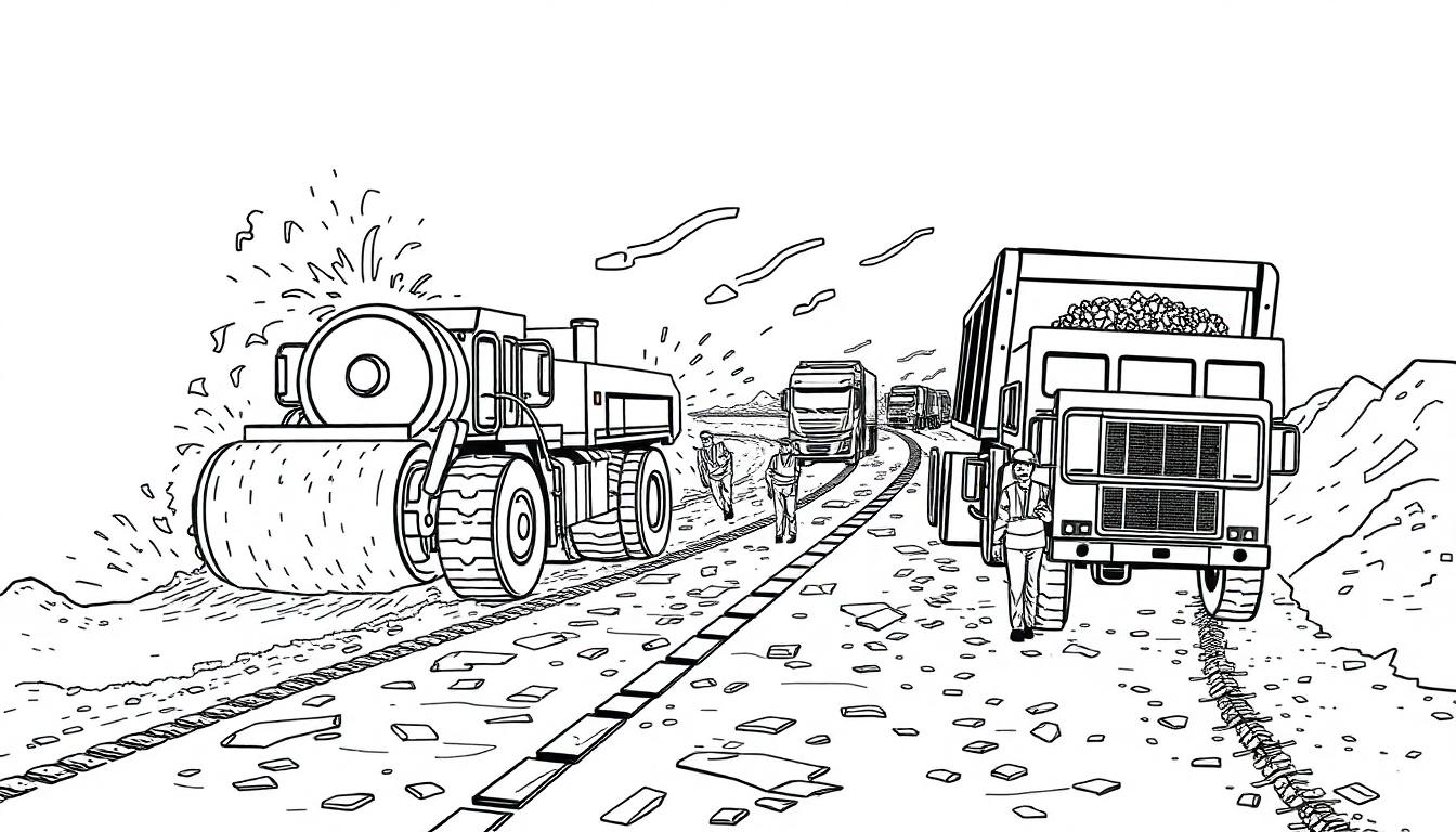 Diese detailreiche Schwarz-Weiß-Ausmalbild-Vorlage zeigt eine lebhafte Baustelle mit einer Straßenwalze, einem Muldenkipper voller Material, arbeitenden Bauarbeitern und weiteren Fahrzeugen auf einer sich schlängelnden Straße. Staub und aufgewirbelter Schmutz deuten auf intensive Bautätigkeiten hin. Perfekt für kleine Baumeister und Technikfans!