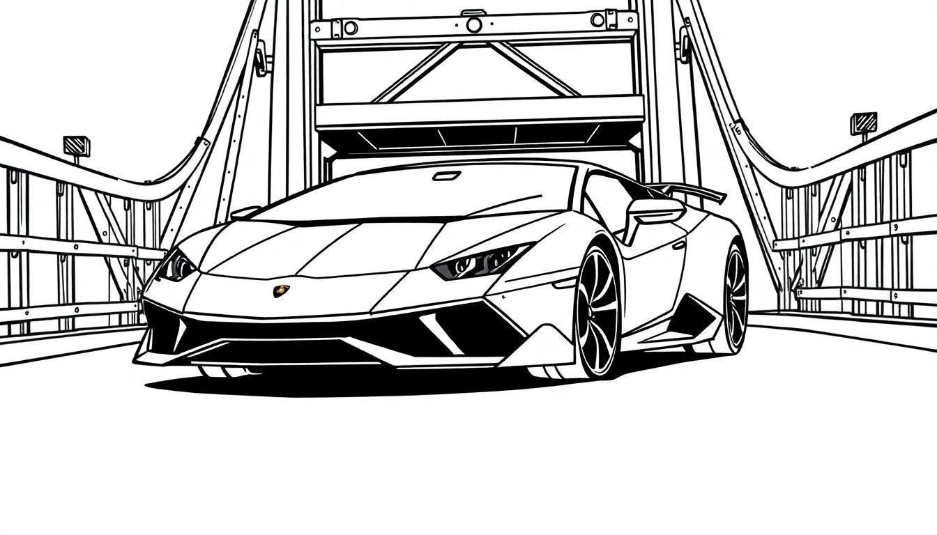 Laden Sie diese kostenlose Ausmalbild-Vorlage herunter und erwecken Sie einen dynamischen Sportwagen, inspiriert vom Lamborghini-Stil, zum Leben. Perfekt für Autofans und Kinder! Zeigt einen detaillierten Umriss eines modernen Sportwagens auf einer Brückenkonstruktion mit mechanischen Elementen im Hintergrund.