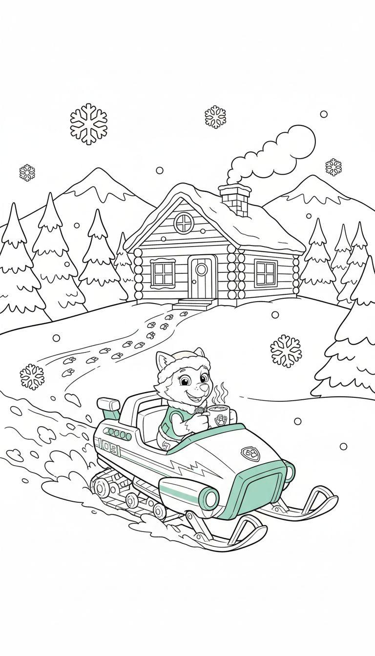 Malvorlage: Husky Welpe auf Schneemobil in Winterlandschaft – Everest Abenteuer