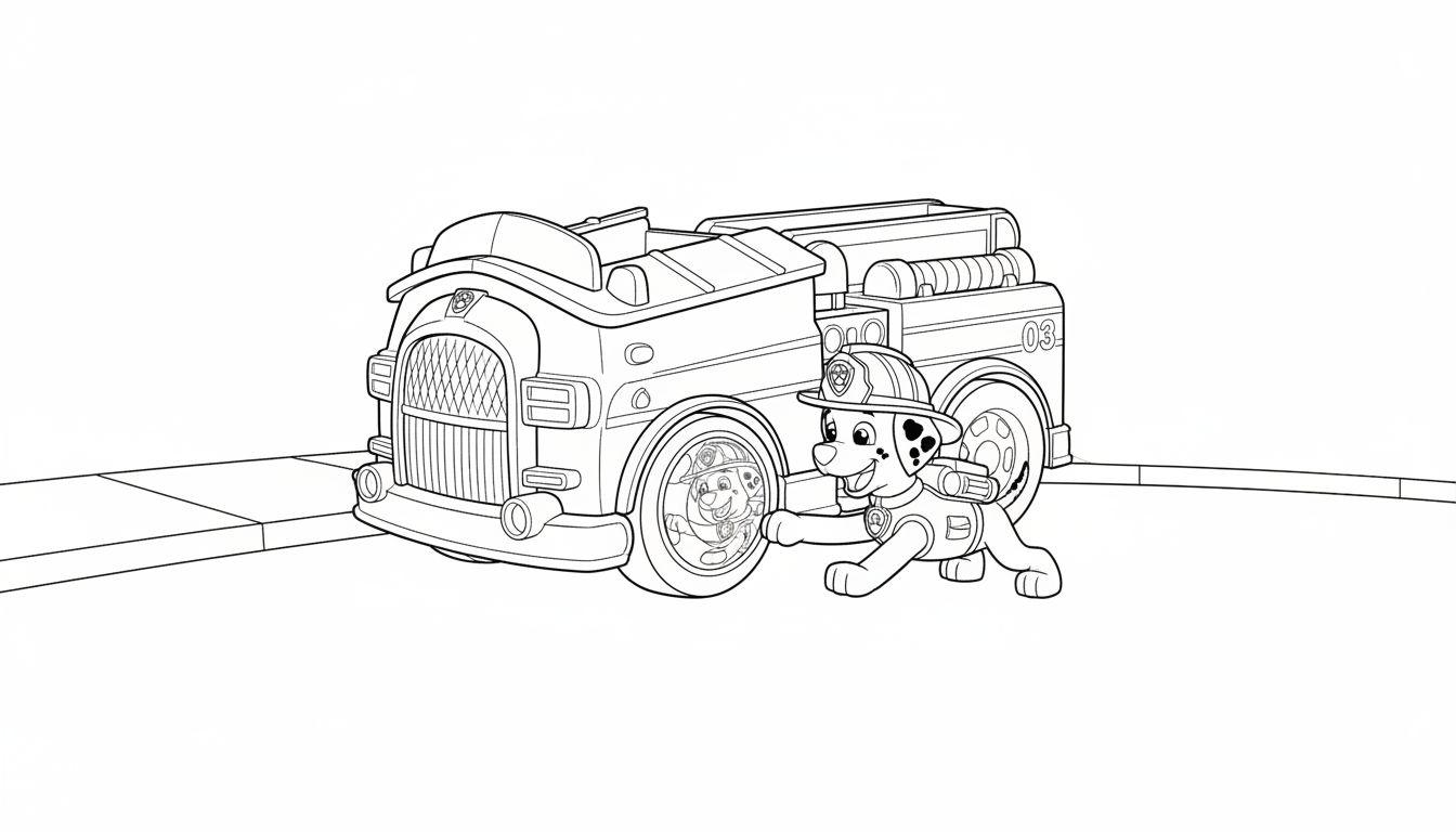 Eine fröhliche Paw Patrol Malvorlage, die Marshall, den tapferen Feuerwehr-Dalmatiner, neben seinem detailreichen Einsatzfahrzeug mit der Nummer „03“ zeigt. Marshall streckt eine Pfote aus, bereit für das nächste Abenteuer. Perfekt für Kinder, um ihre Kreativität beim Ausmalen dieses beliebten Charakters zu entfalten.
