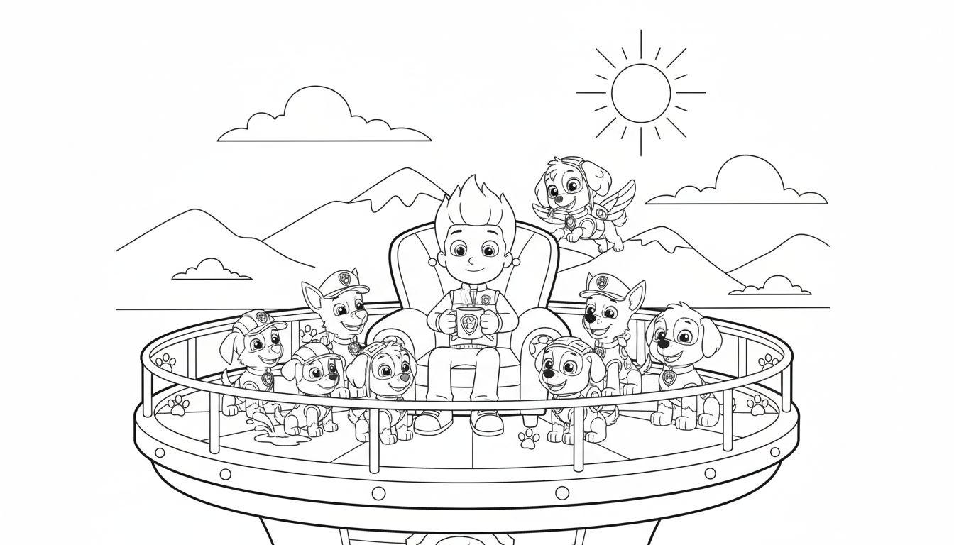Das Detailreichtum des Bildes lädt zum genauen Hinsehen und kreativen Gestalten ein. Vom Paw Patrol-Logo auf Ryders Tasse bis zu den verspielten Pfotenabdrücken auf dem Schiffsdeck – überall gibt es kleine Entdeckungen zu machen. Der Hintergrund mit sanften Bergen, schwebenden Wolken und einer strahlenden Sonne am Himmel verstärkt die idyllische Stimmung. Besonders auffällig ist Skye, die mit ihren Flügeln majestätisch über der Szene schwebt und die Freiheit des Himmels einfängt. Diese Szene voller Freude und Kameradschaft ist eine perfekte Leinwand, um der Fantasie freien Lauf zu lassen und die Welt der Paw Patrol mit Farben zum Leben zu erwecken.
