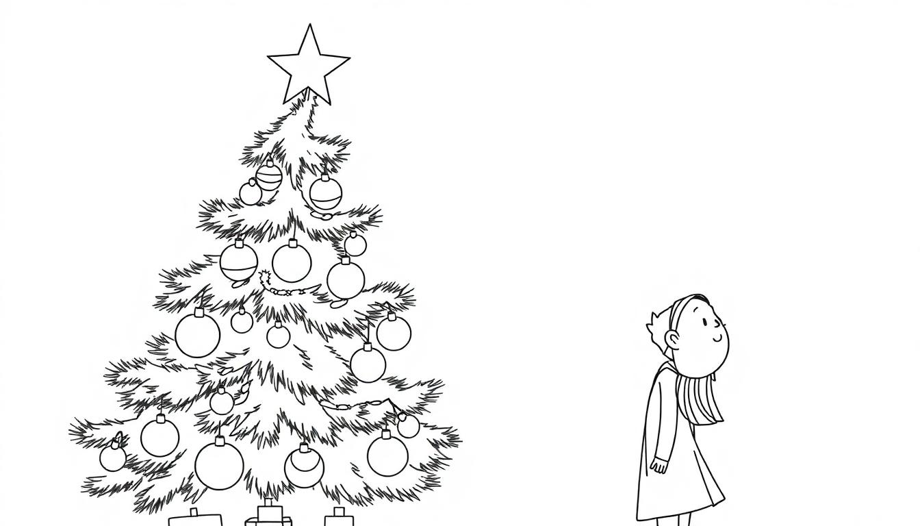 Eine liebevoll gestaltete Ausmalvorlage, die einen prächtig geschmückten Weihnachtsbaum mit Stern und Kugeln auf der linken Seite zeigt. Daneben steht ein Kind im Wintermantel, das den Baum mit einem Lächeln betrachtet. Perfekt für eine festliche und friedliche Ausmalstunde.