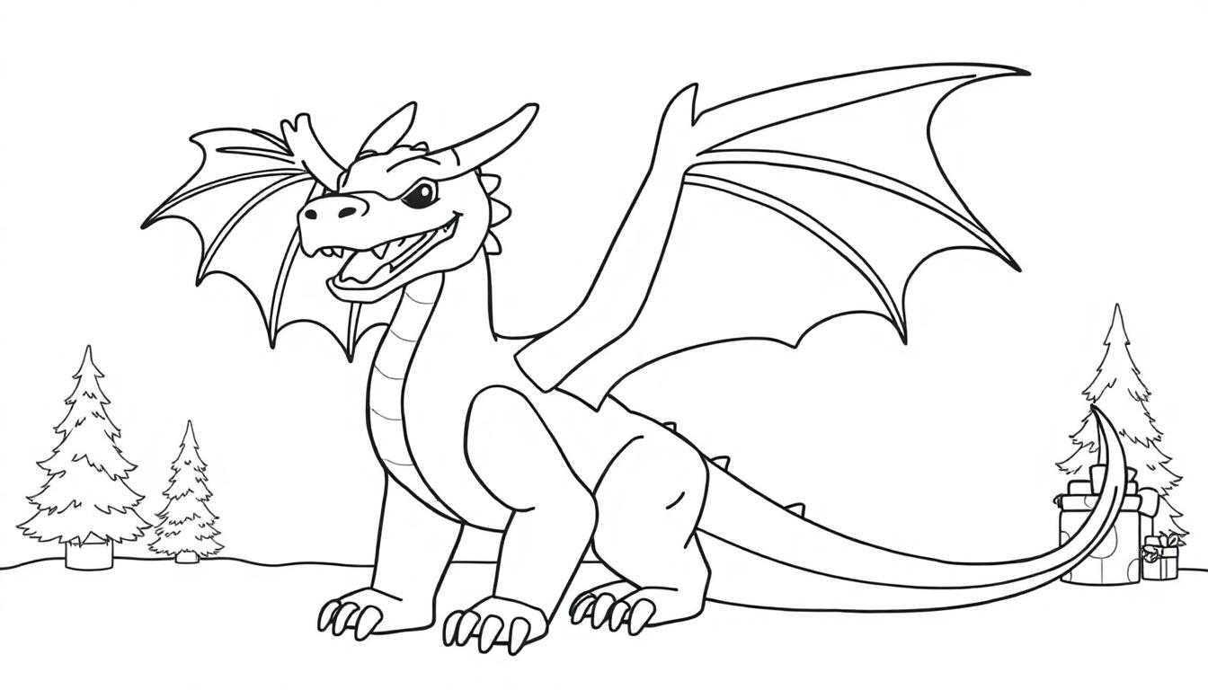 Eine detaillierte Schwarz-Weiß-Linienzeichnung einer Ausmalvorlage. Im Zentrum thront ein lächelnder Drache mit großen Flügeln und Hörnern. Umgeben ist er von winterlichen Tannenbäumen und weihnachtlichen Geschenken auf verschneitem Grund. Perfekt zum kreativen Ausmalen für Kinder.