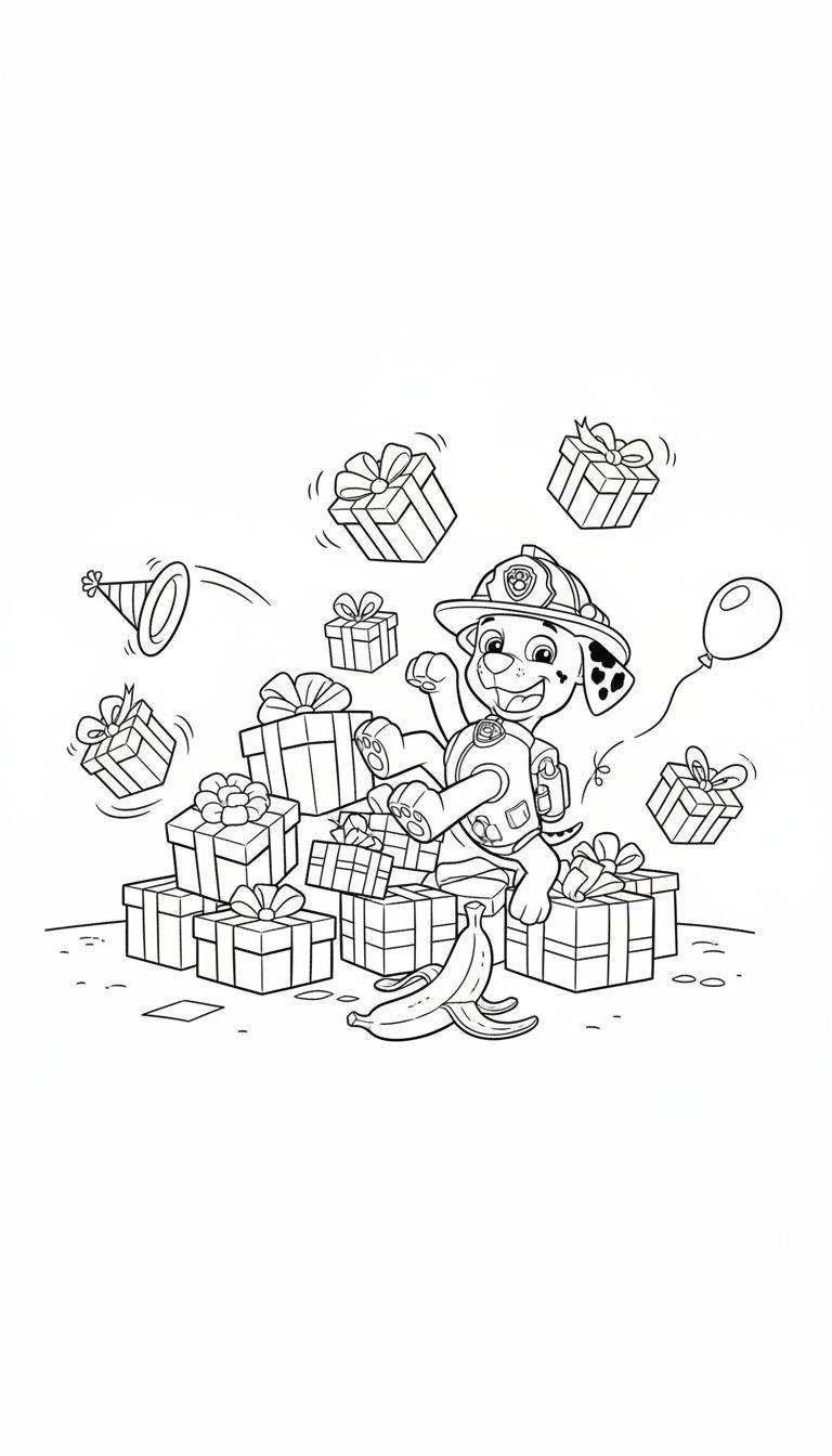 Diese fröhliche Ausmalseite zeigt Marshall, den beliebten Feuerwehrmann-Dalmatiner von Paw Patrol, in seinem charakteristischen Helm und Uniform. Er strahlt vor Freude mit einem breiten Lächeln und leicht sichtbarer Zunge. Marshall ist umgeben von einem riesigen Stapel bunter Geschenke, einige davon kunstvoll mit Schleifen verziert. Ein paar Geschenke schweben sogar dynamisch in der Luft, ergänzt durch einen fliegenden Partyhut und einen schwebenden Ballon. Im Vordergrund liegt eine lustige Bananenschale. Die gesamte Szene versprüht eine ausgelassene und festliche Atmosphäre, ideal zum Ausmalen für kleine Paw Patrol Fans.