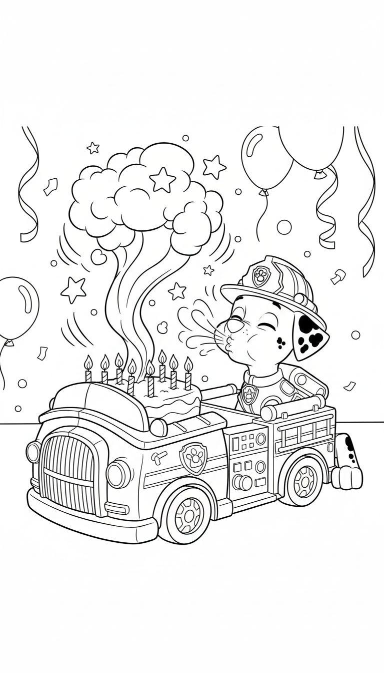 Dieses fröhliche Ausmalbild zeigt Marshall von Paw Patrol, den liebenswerten Dalmatiner-Welpen, in seinem roten Feuerwehrwagen. Er trägt sein charakteristisches Feuerwehr-Outfit und Helm und ist gerade dabei, die sieben brennenden Kerzen auf einer festlichen Geburtstagstorte auszublasen, die prominent vor seinem Fahrzeug platziert ist. Die Szene ist von einer ausgelassenen Party-Stimmung umgeben, mit vielen bunten Ballons, flatternden Girlanden sowie schwebenden Sternen und Konfetti, die Marshalls besonderen Geburtstag feiern.