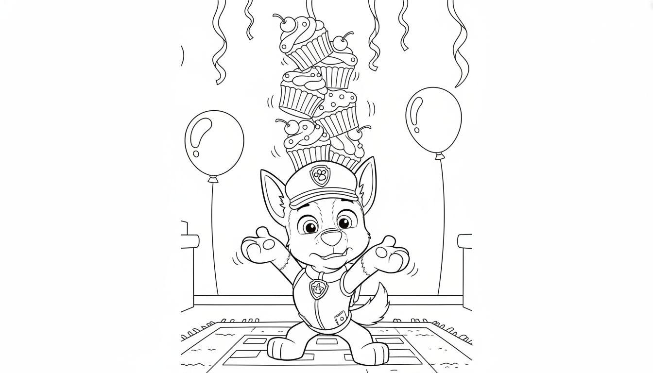 Entdecke dieses lustige Paw Patrol Ausmalbild von Chase, dem mutigen Polizeihund! Er balanciert geschickt einen imposanten Stapel von sechs Cupcakes auf seinem Kopf, einige davon verziert mit Kirschen und bunten Streuseln. Die Szene ist von festlichen Luftballons und Girlanden umrahmt, was auf eine fröhliche Party oder einen Geburtstag hindeutet. Chase trägt seine ikonische Polizeiuniform und ist hochkonzentriert, um die wackeligen Leckereien nicht fallen zu lassen. Der Boden ist mit einem gemusterten Teppich oder Fliesen versehen, während der Hintergrund leer bleibt und viel Raum für kreative Farbgestaltung bietet. Perfekt für kleine Paw Patrol Fans und alle, die Geburtstagsfeiern lieben!