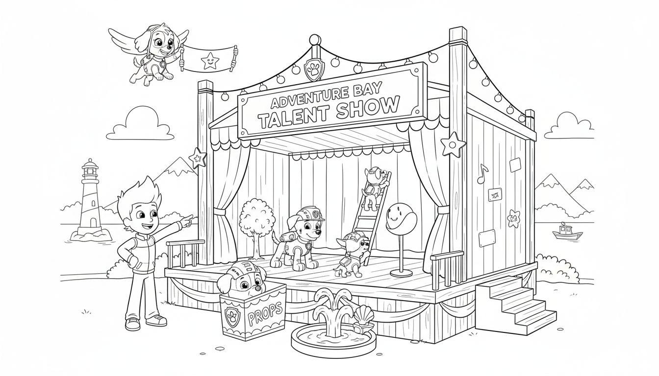 Diese bezaubernde Ausmalseite entführt Fans der Paw Patrol direkt in das Herz der Abenteuerbucht, wo die alljährliche Talent-Show in vollem Gange ist! Die detaillierte Schwarz-Weiß-Zeichnung lädt dazu ein, die Szene mit bunten Farben zum Leben zu erwecken. Im Mittelpunkt steht ein festlich geschmücktes Open-Air-Podium, das stolz den Titel „ADVENTURE BAY TALENT SHOW“ trägt und von strahlenden Lichtern und Sternen gesäumt wird. Marshall ist schon bereit für seinen Auftritt, während Rocky geschickt eine Leiter erklimmt und Chase von oben begeistert winkt – ein wahrhaft dynamisches Trio!