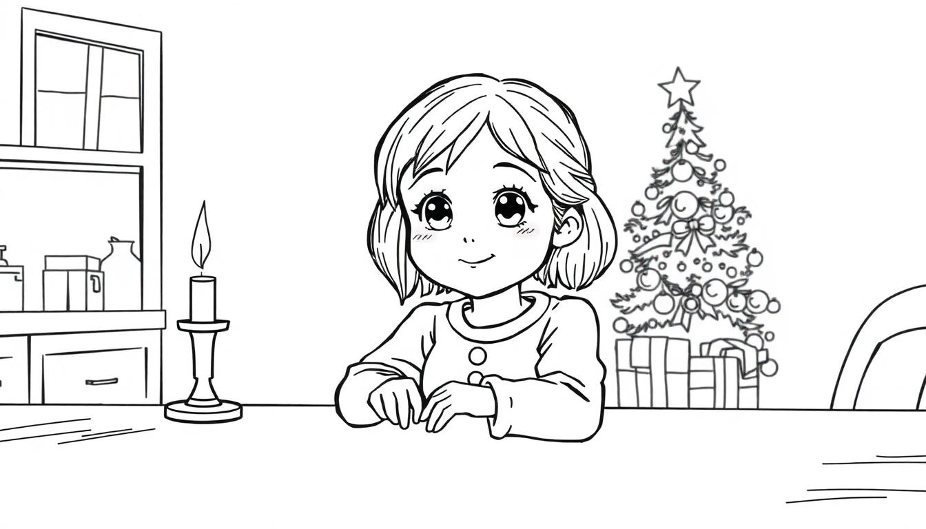 Dieses wunderschöne Ausmalbild entführt uns in eine Idylle der Vorweihnachtszeit. Im Zentrum thront ein junges Mädchen, dessen aufmerksamer Blick und sanftes Lächeln eine tiefe Vorfreude auf das Fest verraten. Die Hände des Kindes ruhen ruhig auf dem Tisch, während es die stimmungsvolle Umgebung aufsaugt. Die Details wie die Knöpfe an ihrem Oberteil und die angedeuteten roten Wangen laden dazu ein, diese Szene mit lebendigen Farben zu füllen und ihr eine persönliche Note zu verleihen. Hinter ihr erstreckt sich ein Regal mit verschiedenen Objekten, das die Gemütlichkeit des Raumes unterstreicht. Ein Fenster lässt vielleicht das Licht der Sterne hereinfallen, während auf dem Tisch eine brennende Kerze für behagliche Atmosphäre sorgt.