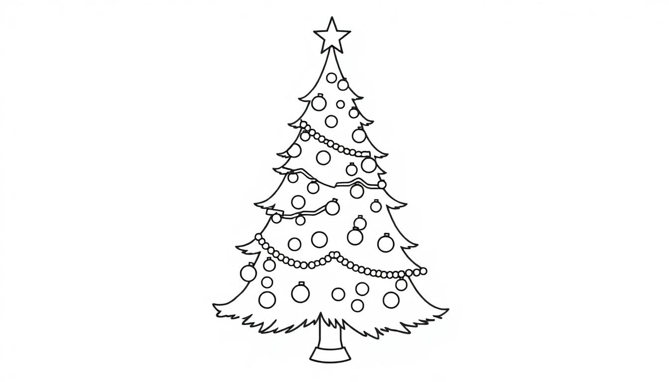 Diese Ausmalvorlage zeigt eine detaillierte Schwarz-Weiß-Umrisszeichnung eines stilisierten Weihnachtsbaumes. Der Baum hat eine klassische, konische Form mit mehreren Ebenen, gekrönt von einem fünfzackigen Stern. Er ist reich mit runden Weihnachtskugeln und spiralförmigen Girlanden verziert, die auf einem einfachen Ständer ruhen. Perfekt für kreative Weihnachtsaktivitäten.