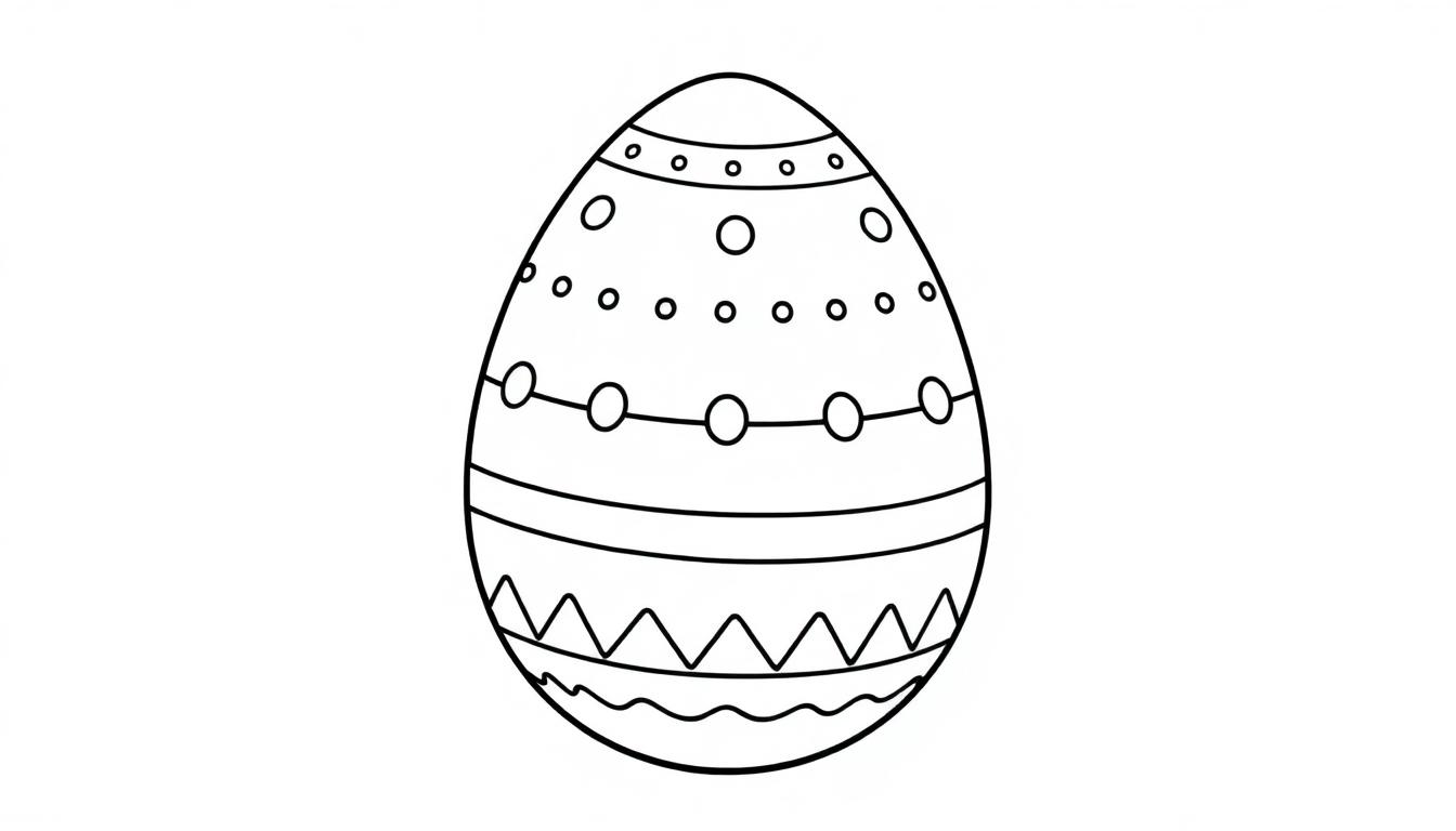 Eine detailreiche Schwarz-Weiß-Strichzeichnung eines verzierten Eis, das an ein Osterei erinnert. Die Oberfläche ist in mehrere horizontale Bänder mit unterschiedlichen Mustern unterteilt, darunter Punkte, verbundene Kreise, glatte Linien, ein Zickzack-Muster und ein wellenförmiges Muster am unteren Rand. Ideal zum Ausmalen für Kinder und Erwachsene.