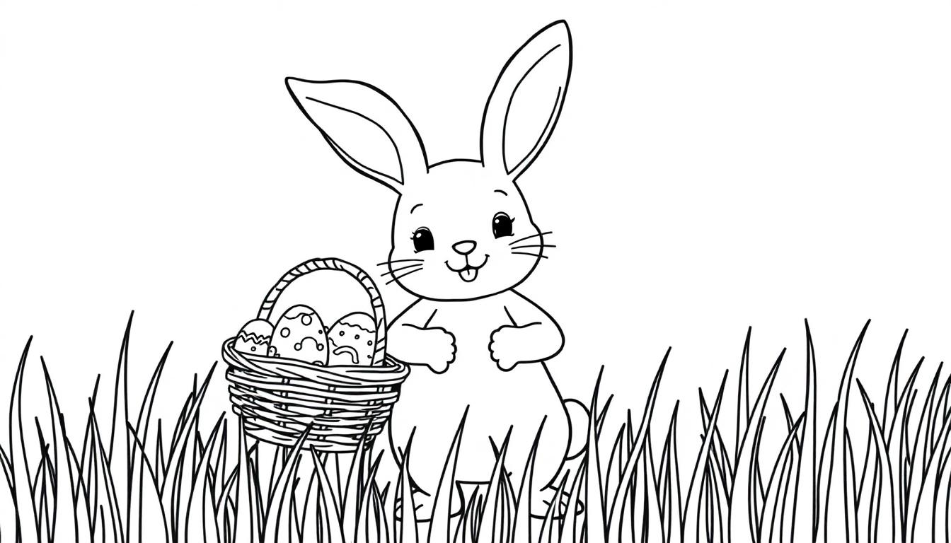 Das hohe Gras, das den Hasen und den Korb umgibt, bietet eine weitere Ebene zum Ausmalen, sodass das gesamte Bild zu einem lebendigen Frühlingsbild werden kann. Der leere, weiße Hintergrund sorgt dafür, dass der Fokus voll und ganz auf dem Motiv liegt. Egal ob mit leuchtenden Farben oder sanften Pastelltönen – diese Malvorlage garantiert stundenlangen Malspaß und ein bezauberndes Ergebnis, das jedes Osternest verschönern würde.