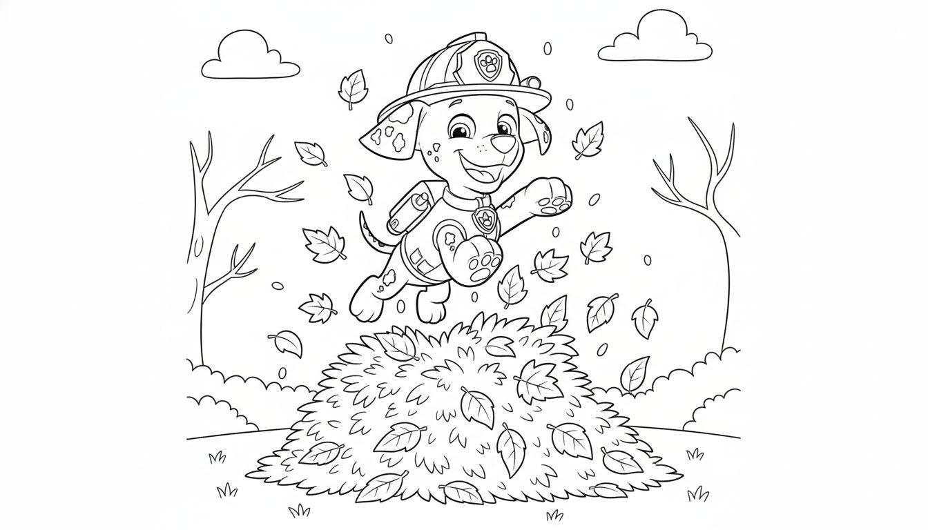 Marshall stürzt sich ins Herbstabenteuer auf diesem Ausmalbild