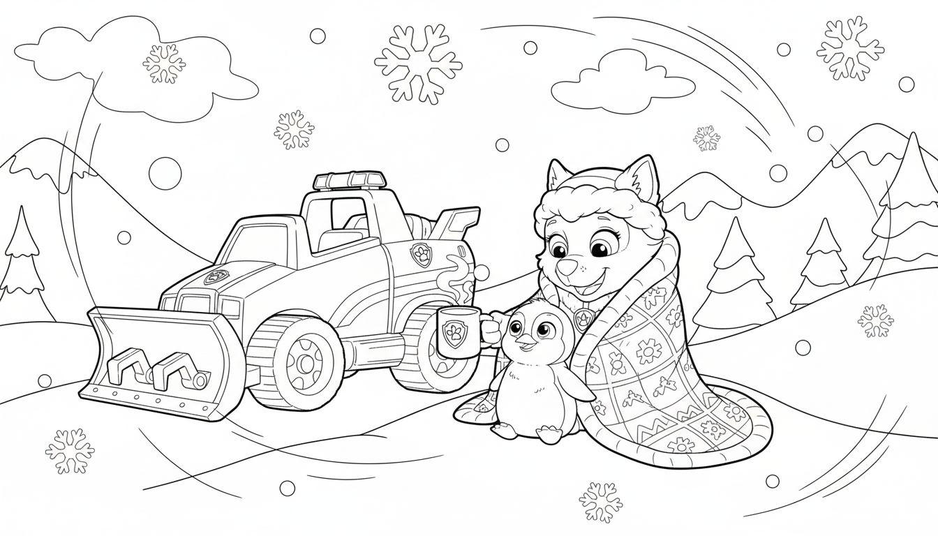 Dieses bezaubernde Ausmalbild entführt Kinder in eine warme und gemütliche Winterwelt, in deren Mittelpunkt Everest von Paw Patrol steht. Der schneeliebe Husky, bekannt für ihre Hilfsbereitschaft und ihren Mut, sitzt hier entspannt in eine kuschelige Decke gewickelt. Neben ihr sorgt ein kleiner, fröhlicher Pinguin für gute Laune, während beide eine dampfende Tasse genießen – perfekt, um sich nach einem Tag im Schnee aufzuwärmen.