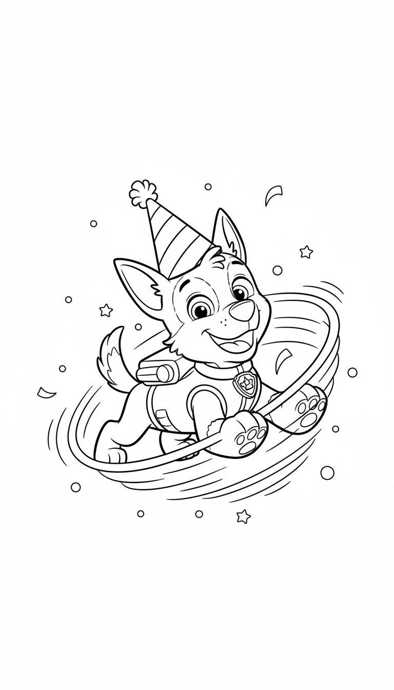 Die detaillierte Linienzeichnung zeigt Chase nicht nur in festlicher Garderobe mit einem Pompon-Hut und seiner typischen Ausrüstung, sondern fängt auch seine Energie ein. Die dynamischen Wirbellinien um ihn herum lassen erahnen, dass er sich mitten in einer ausgelassenen Bewegung befindet, vielleicht rennt oder tanzt er vor Freude. Ergänzt wird die Szenerie durch verspielte Elemente wie Sterne, Kreise und andere abstrakte Formen, die wie Konfetti wirken und die festliche Stimmung perfekt abrunden.