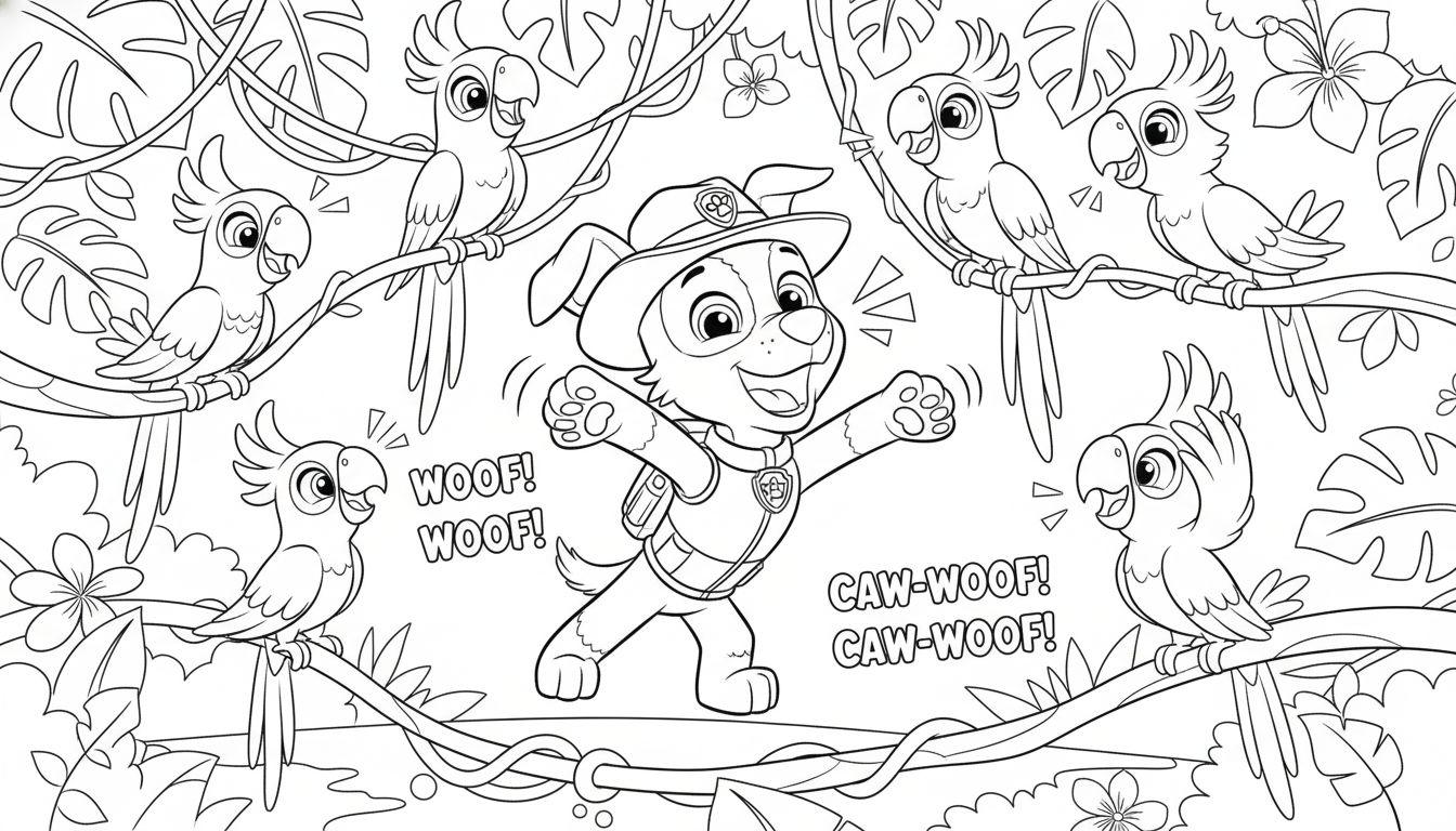 Eine charmante, schwarz-weiße Malvorlage mit einem lebhaften tropischen Motiv. Im Mittelpunkt springt ein fröhlicher Hund namens Tracker hoch in die Luft, ausgestattet mit einem kleinen Hut und einem Rucksack oder Weste, verziert mit einem Abzeichen. Er scheint enthusiastisch ‚WOOF! WOOF!‘ und ‚CAW-WOOF! CAW-WOOF!‘ zu rufen. Sechs aufgeregte Papageien mit teils Federhauben sind um ihn herum auf dicken Ästen positioniert und reagieren ebenfalls mit eigenen Lautäußerungen auf das ausgelassene Treiben. Die Szene ist eingebettet in eine üppige Dschungellandschaft mit großen Blättern, Lianen und exotischen Blüten, die zum Ausmalen einlädt und eine Atmosphäre voller Freude und Abenteuer vermittelt.