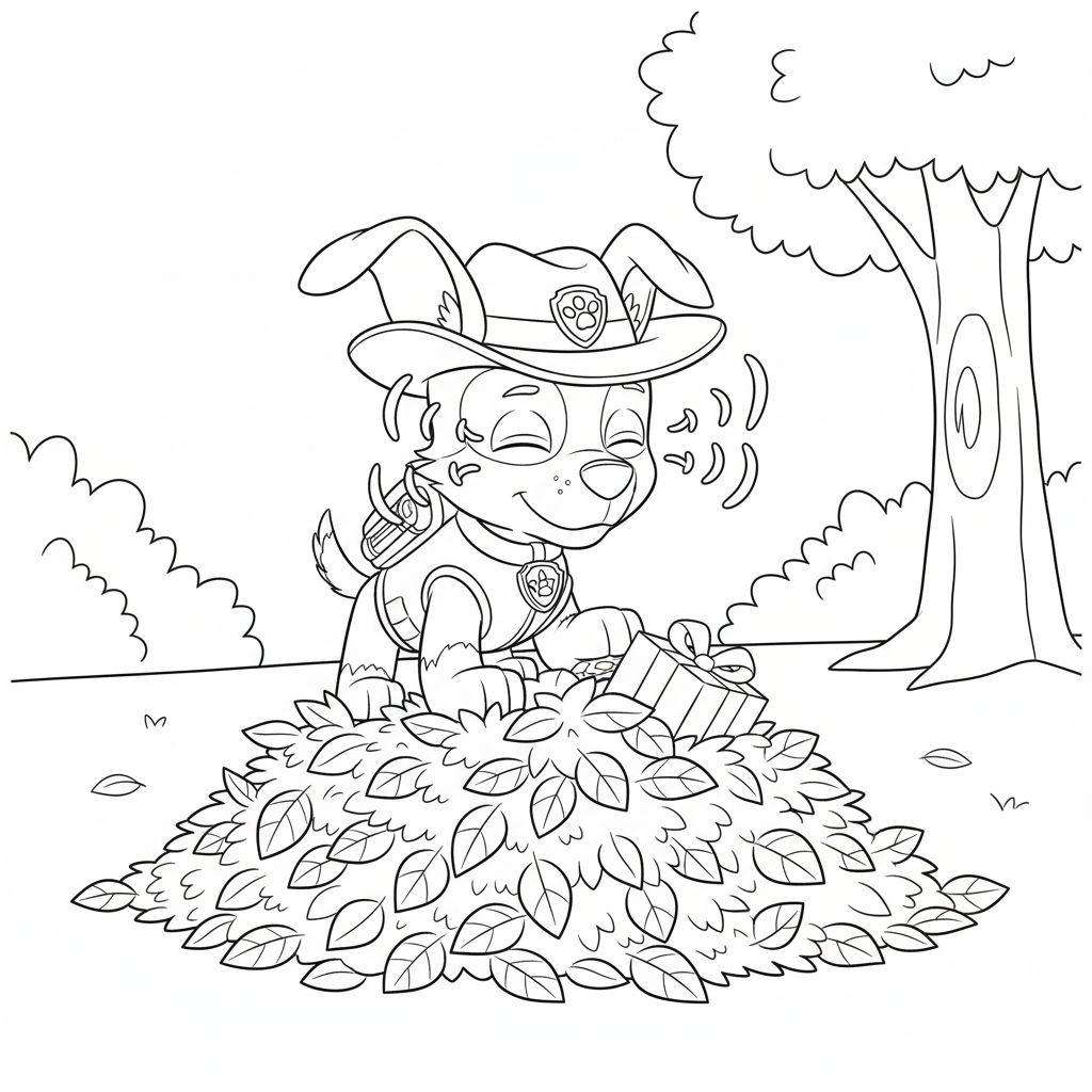 Diese detaillierte Malvorlage zeigt einen fröhlichen Welpen namens ‚Tracker‘, der mitten in einem großen Haufen bunter Herbstblätter sitzt. Der Welpe trägt einen Cowboy- oder Safarihut mit einem Abzeichen, ein Halsband und ein Westchen/Geschirr, ebenfalls mit einem Emblem. Er hält ein kleines, verpacktes Geschenk mit einem Band in seinen Pfoten. Seine Augen sind geschlossen und ein breites Lächeln ziert sein Gesicht, was seine Freude und Zufriedenheit ausdrückt. Ein kleiner Rucksack ist an seinem Rücken befestigt. Rund um den Blätterhaufen liegen weitere lose Blätter. Im Hintergrund sind rechts ein Baumstamm mit einem Teil der Baumkrone sowie wirbelnde Linien, die fallende Blätter oder Windböen darstellen könnten, zu sehen. Links und weiter hinten im Hintergrund sind Konturen von Sträuchern oder Büschen angedeutet. Eine gemütliche Herbstszene, perfekt zum Ausmalen.