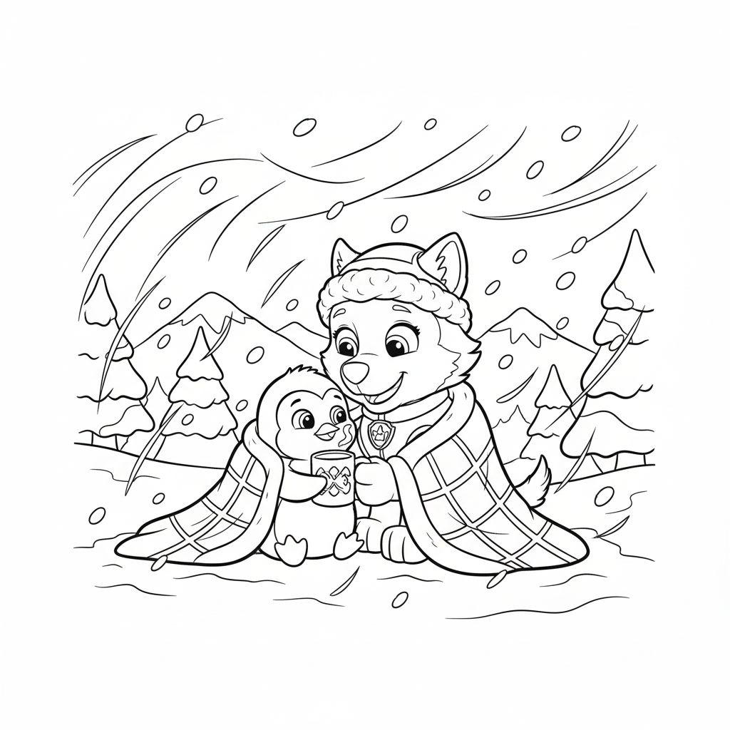 Der „Subject: Everest“-Hinweis deutet stark auf die beliebte Hündin Everest aus der Kinderserie Paw Patrol hin, die selbst ein Husky ist und eine tiefe Liebe zum Schnee und zu Winterabenteuern hegt. Diese Malvorlage scheint eine Hommage an ihren Charakter zu sein, der für seine Freundlichkeit, Hilfsbereitschaft und seine Fähigkeit bekannt ist, in jeder Situation Wärme und positive Stimmung zu verbreiten. Die Darstellung des Hundes als Beschützer und Freund, der gemeinsam mit seinem kleinen Pinguin-Gefährten die winterliche Gemütlichkeit genießt, spiegelt Everests liebevolle und fürsorgliche Art wider und macht diese Malvorlage zu einem besonderen Erlebnis für alle Fans der heldenhaften Hündin.