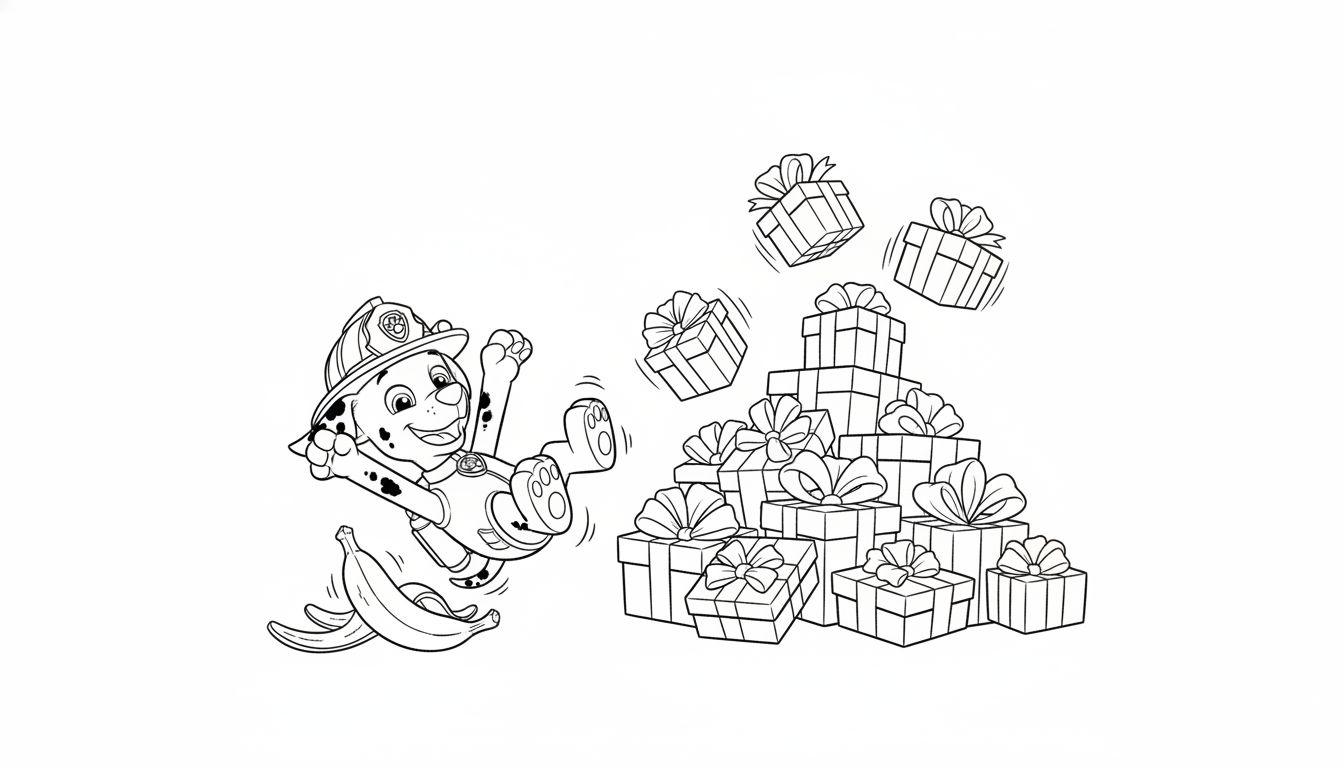 Diese Schwarz-Weiß-Ausmalseite zeigt Marshall, den fröhlichen Dalmatiner aus Paw Patrol, in einem urkomischen Moment des Stolperns. Marshall ist links im Bild zu sehen, wie er rückwärts über eine Bananenschale ausrutscht, die unter seinen Füßen liegt. Seine Arme und Beine sind in der Luft, und auf seinem Gesicht liegt ein überraschter oder lachender Ausdruck. Er trägt seinen charakteristischen roten Feuerwehrhelm und seine Uniform. Rechts daneben stapelt sich eine große Menge festlich verpackter Geschenke mit Schleifen, während weitere Pakete durch die Luft schweben oder fallen. Ein perfektes Ausmalbild für Fans von Paw Patrol, das Spaß, Abenteuer und ein bisschen Tollpatschigkeit vereint und eine fröhliche, festliche Stimmung vermittelt.