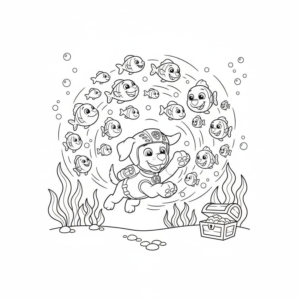 Zuma Paw Patrol Malvorlage: Fröhliches Unterwasser-Tauchabenteuer mit Fischen und Schatzkiste