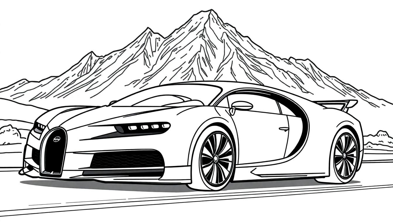 Eine Schwarz-Weiß-Strichzeichnung eines modernen, Bugatti Chiron-ähnlichen Sportwagens, der auf einer breiten Straße vor einer majestätischen Bergkulisse steht. Perfekt zum Ausmalen für Auto- und Designfans.
