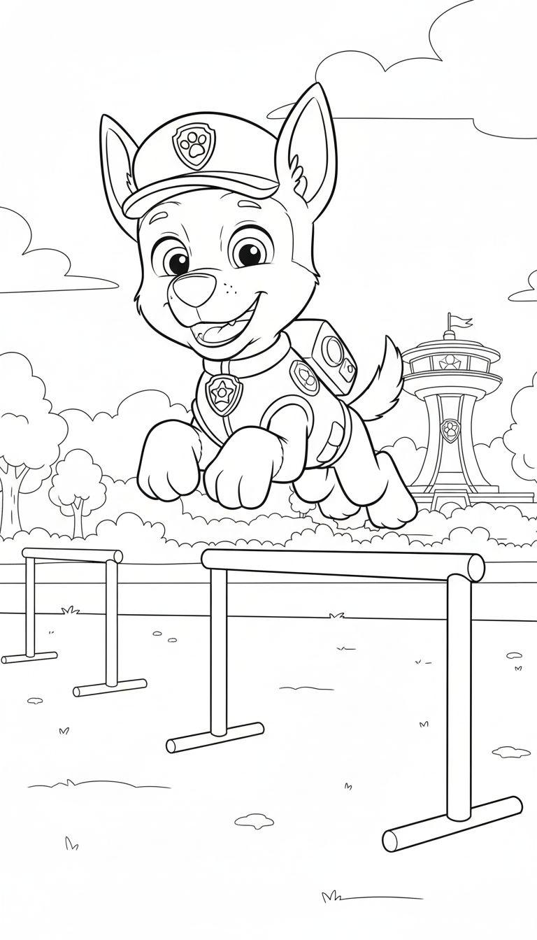 Dieses dynamische Ausmalbild zeigt den beliebten Polizeihund Chase von Paw Patrol in voller Aktion. Er ist fröhlich in die Luft gesprungen und überwindet geschickt eine niedrige Hürde aus Stöcken. Chase trägt seine ikonische Polizeiuniform mit Mütze, die sein Paw Patrol Emblem ziert, und hat ein breites, glückliches Lächeln auf dem Gesicht. Im Hintergrund ist der markante Paw Patrol Aussichtsturm mit Flagge zu sehen, umgeben von Bäumen, Büschen und Wolken, was die Szene eines spannenden Agility-Parcours im Freien perfekt abrundet. Der Boden ist mit Gras oder Erde bedeckt, akzentuiert durch lose Grashalme oder ‚M‘-förmige Markierungen.
