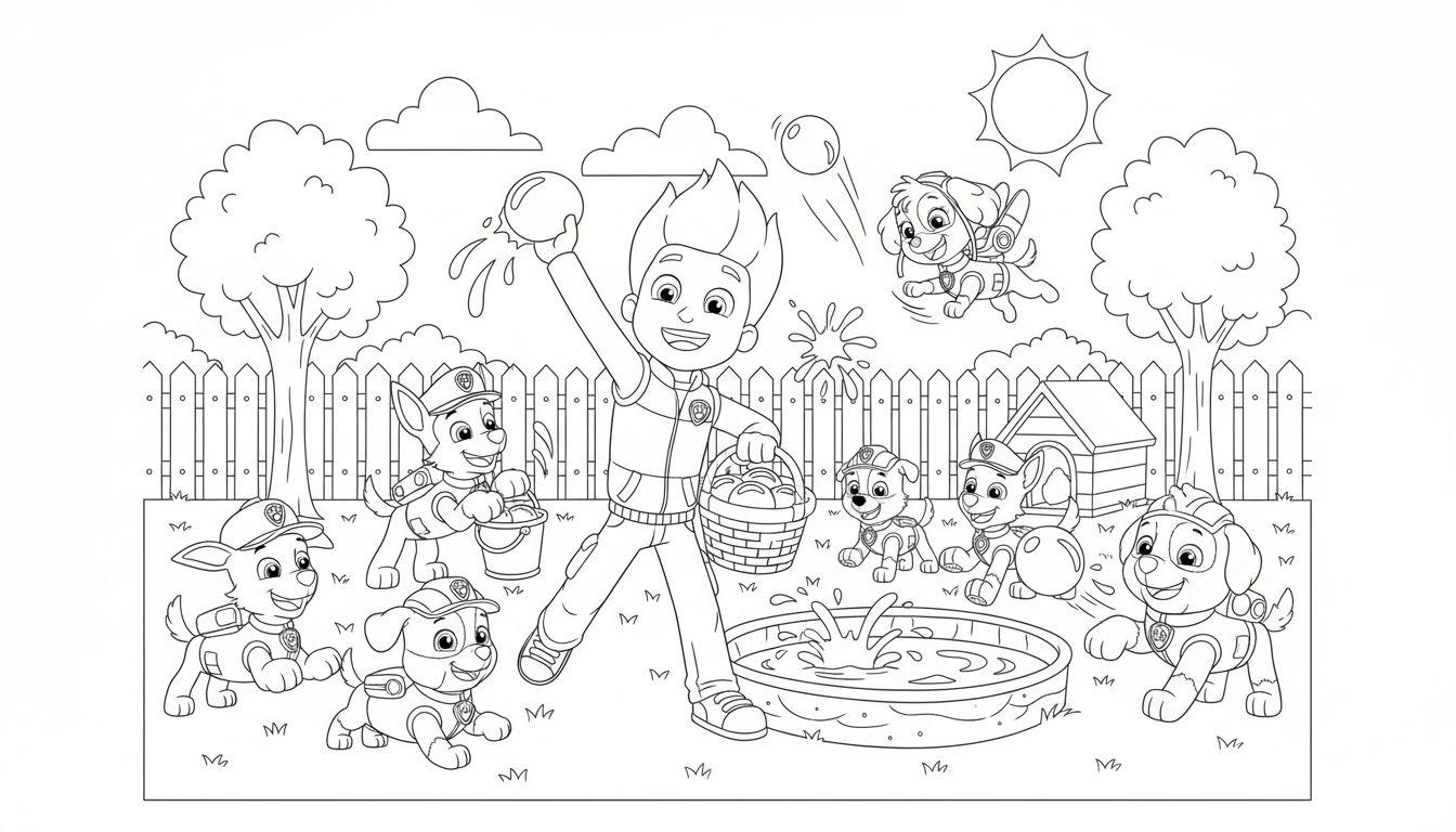 Dieses fröhliche Ausmalbild zeigt Ryder und die beliebten Paw Patrol Pups bei einer ausgelassenen Wasserballonschlacht an einem sonnigen Tag. Im Mittelpunkt steht Ryder, der lachend einen Wasserballon hochwirft und einen Korb voller Ballons dabei hat. Um ihn herum sind seine treuen Begleiter verteilt: Skye fliegt rechts oben mit einem Wasserballon, Chase steht links unten mit einem Eimer voller Nachschub. Marshall, Rocky, Rubble (neben einem Hundehok) und Zuma sind glücklich auf dem grasbewachsenen Boden zu sehen. Eine zentrale Wasserpfütze mit spritzendem Wasser deutet auf einen kürzlich gelandeten Ballon hin. Im Hintergrund sind zwei Bäume, ein Holzzaun, ein Hundehok und eine strahlende Sonne mit Wolken zu erkennen. Eine sommerliche Szene voller Spaß und Freundschaft, ideal zum Ausmalen und Träumen vom nächsten Abenteuer.
