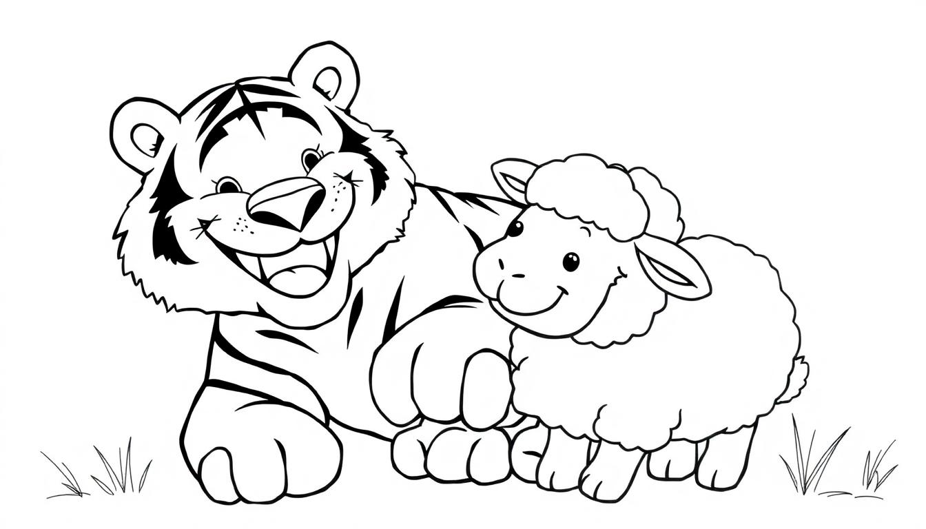 Ausmalbild: Freundschaft zwischen Tiger und Schaf