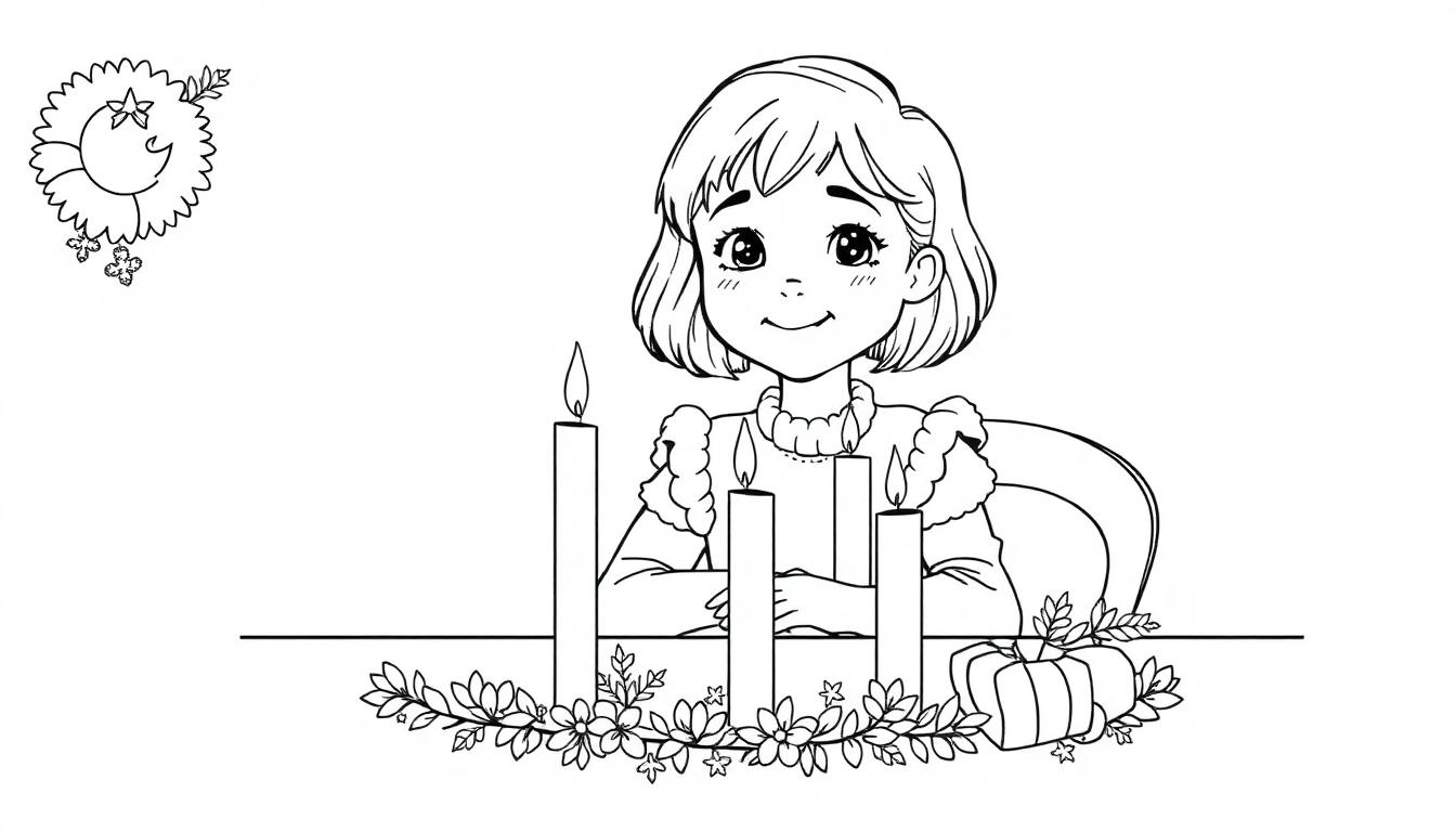 Diese Ausmalvorlage fängt einen Moment purer Freude und Gemütlichkeit ein. Im Zentrum steht ein junges Mädchen mit einem strahlenden Lächeln und großen, ausdrucksstarken Augen, die die Betrachterin oder den Betrachter sofort in ihren Bann ziehen. Ihr bezauberndes Outfit mit den Rüschen am Kragen und an den Ärmeln verleiht ihr einen verspielten Touch. Hinter dem Tisch sitzend, scheint sie die besondere Atmosphäre zu genießen, die durch die vier Kerzen erzeugt wird. Drei der Kerzen brennen hell und werfen ein warmes Licht auf die Szene, was sofort an gemütliche Abende oder besondere Anlässe denken lässt.