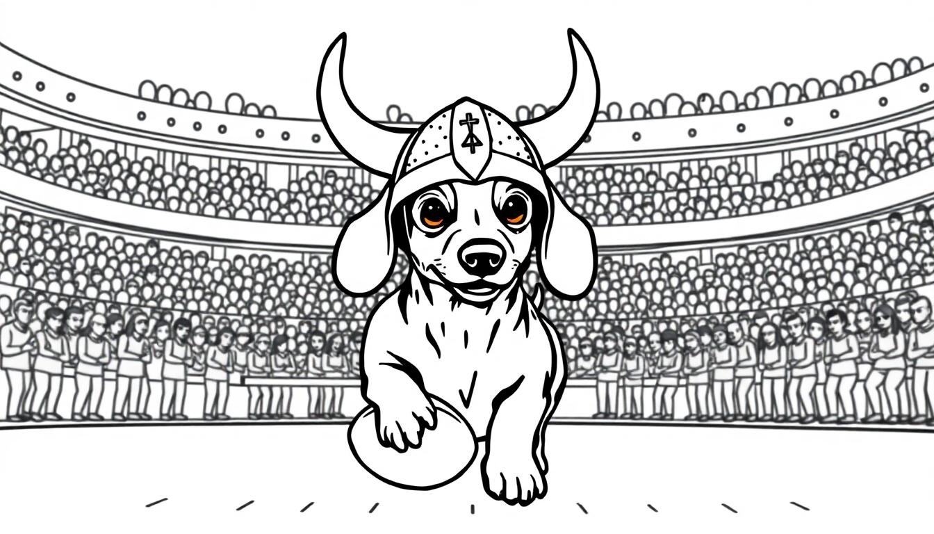 Eine Schwarz-Weiß-Strichzeichnung eines kleinen Hundes mit Wikingerhelm und Football im Stadion, bereit zum Ausmalen.