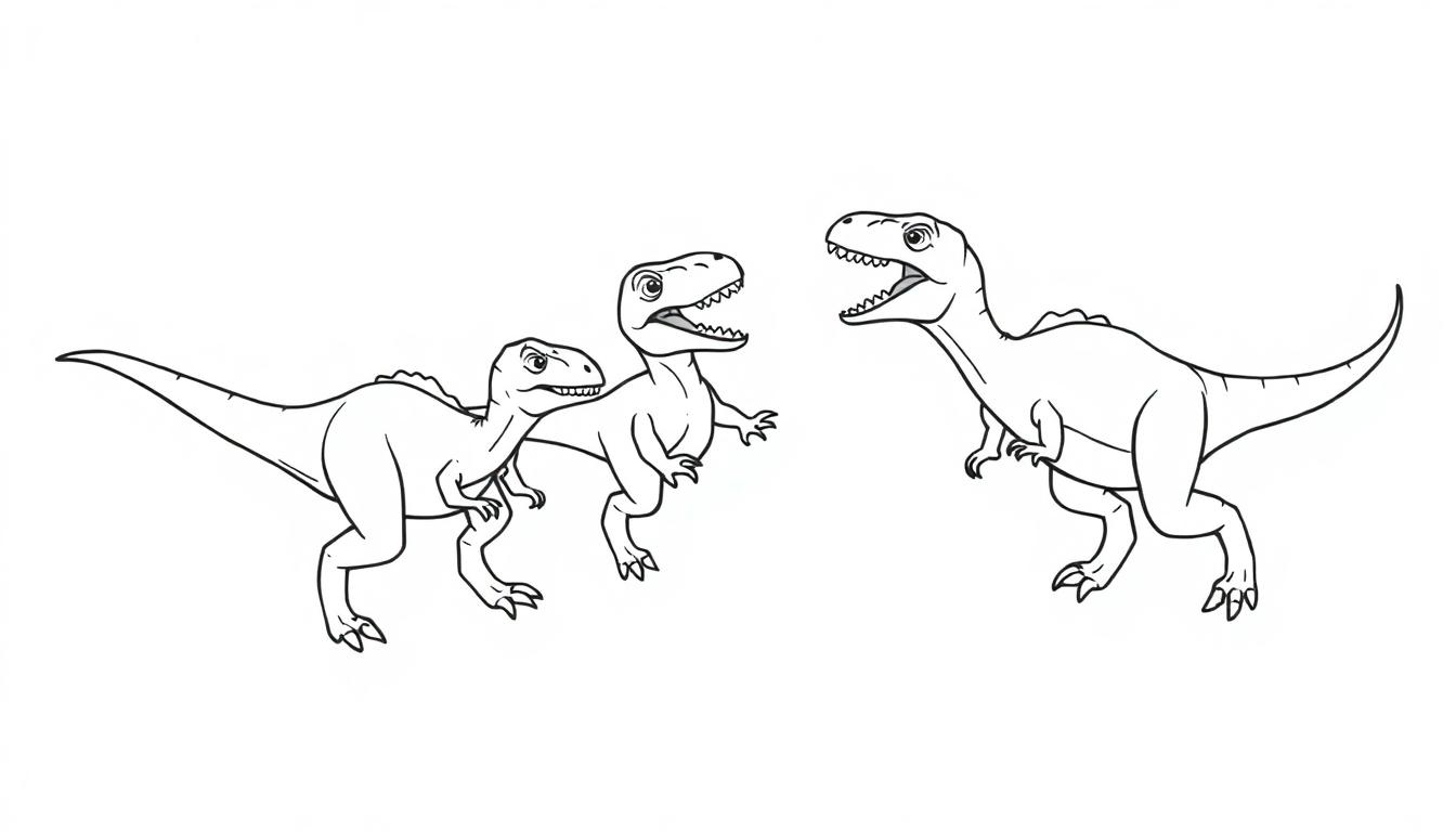 Eine detailreiche Schwarz-Weiß-Strichzeichnung im Ausmalbild-Stil, die drei bipedale Dinosaurier zeigt. Auf der linken Seite posieren zwei kleinere Dinosaurier, einer mit geschlossenem, aber zahnbehaftetem Maul und ein zweiter mit weit geöffnetem, schreiendem Maul. Rechts steht ein deutlich größerer Dinosaurier, dessen riesiges, zahnreiches Maul ebenfalls weit aufgerissen ist, als würde er brüllen. Rückenplatten zieren die Rücken aller drei Tiere. Perfekt zum Ausmalen und Entdecken prähistorischer Welten.