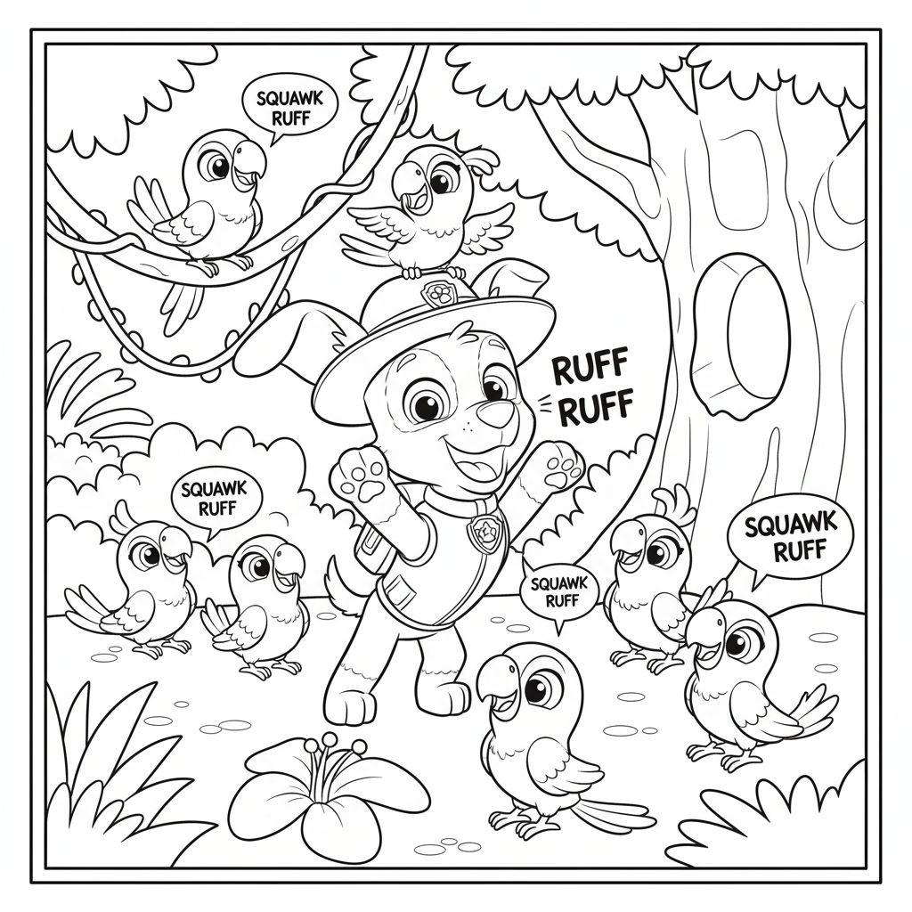 Dieses spannende Schwarz-Weiß-Ausmalbild entführt dich in ein tropisches Dschungelabenteuer mit Tracker, dem beliebten Hund aus Paw Patrol! Im Zentrum steht ein überglücklicher Tracker in Safarihut und Uniform, seine Pfoten sind energisch erhoben, als würde er rennen oder springen, und ein breites Lachen ziert sein Gesicht. Um ihn herum schwirren und sitzen sieben fröhliche kleine Vögel, die wie bunte Papageien oder Sittiche aussehen. Einer von ihnen hat es sich sogar auf Trackers Hut gemütlich gemacht, während andere auf Lianen oder am Boden sitzen, einige mit ausgebreiteten Flügeln. Die Szenerie wird durch eine üppige Dschungellandschaft mit dichten Bäumen, verschlungenen Lianen und vielen Blättern vervollständigt. Rechts ist ein Baumstamm mit einer hohlen Öffnung zu sehen, und im Vordergrund blüht eine große tropische Blume. Textballons mit „RUFF RUFF“ und „SQUAWK RUFF“ unterstreichen die lebhafte und abenteuerliche Stimmung dieser einzigartigen Ausmalseite.