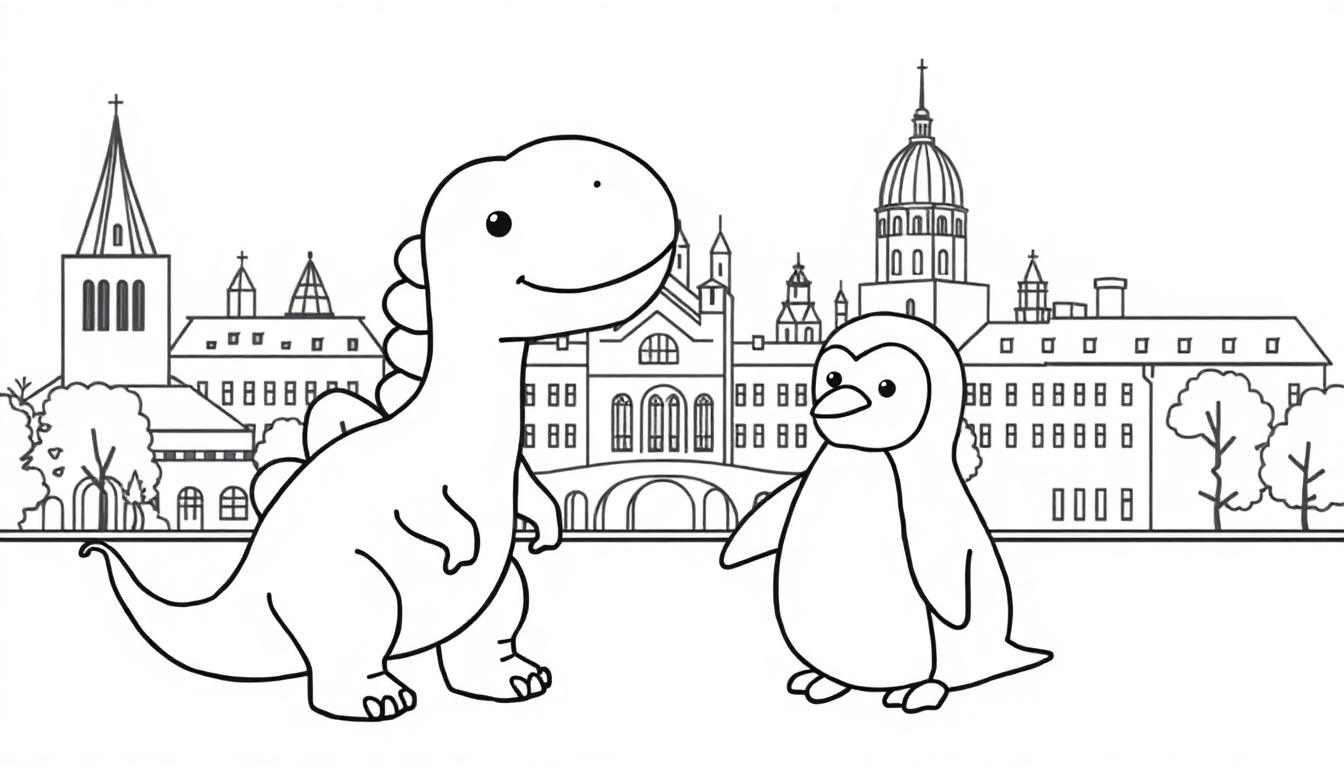 Eine Schwarz-Weiß-Strichzeichnung als Malvorlage. Im Vordergrund stehen ein großer, lächelnder Dinosaurier und ein kleinerer, freundlicher Pinguin. Beide Figuren blicken nach vorne. Der Hintergrund zeigt eine detaillierte Stadtkulisse mit einer Kirche, Gebäuden mit Bögen und einer Kuppel. Stilisierte Bäume ergänzen die Szene. Ideal zum kreativen Ausmalen für Kinder und Erwachsene.