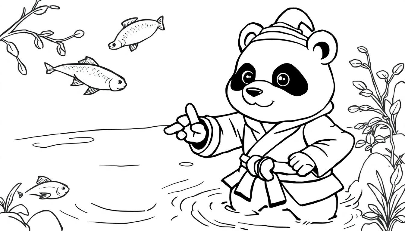 Eine friedliche Schwarz-Weiß-Szene zum Ausmalen, die einen lächelnden Panda in traditioneller Kleidung zeigt, der am Wasser steht und auf Fische deutet. Zwei Fische springen aus dem Wasser, während ein dritter unten schwimmt. Die Umgebung ist mit Wasserpflanzen und einem Ast mit Blättern verziert.