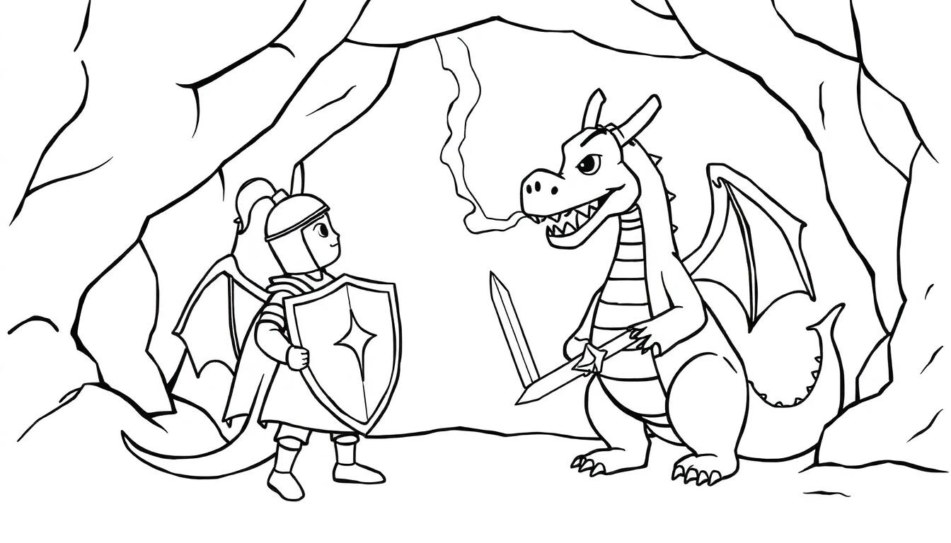 Willkommen zu einer besonderen Ausmalvorlage, die die Grenzen der Vorstellungskraft sprengt! Auf diesem Bild finden wir uns tief in einer geheimnisvollen Höhle wieder, deren Wände und Decke nur angedeutet sind. Doch das Herzstück der Szene sind die beiden Hauptakteure: ein kleiner, aber mutiger Ritter und ein imposanter Drache. Der Ritter, gekleidet in eine kleine Rüstung und mit einem Helm, trägt nicht nur einen ovalen Schild, sondern überraschenderweise auch winzige Drachenflügel auf dem Rücken – ein Symbol für seine Verbindung zur Welt der Fabelwesen?