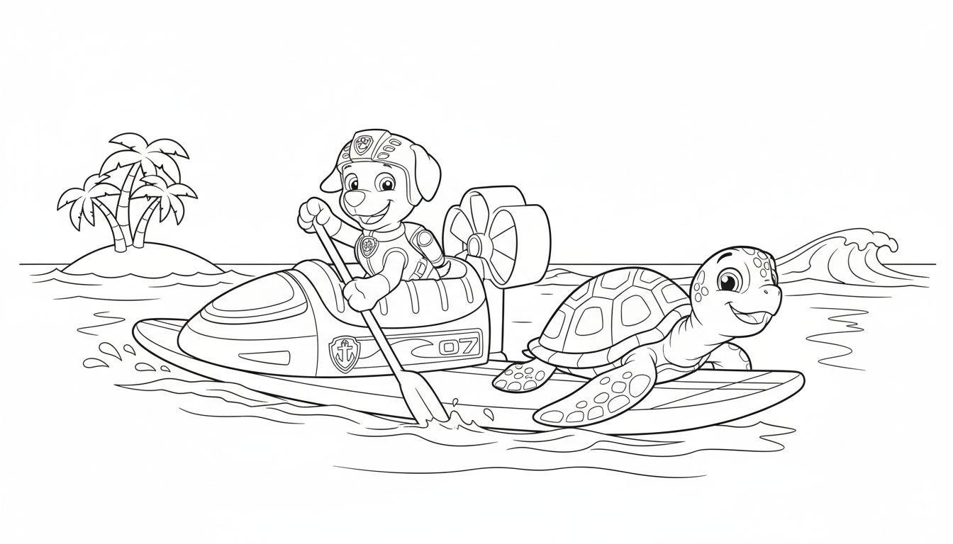 Diese Schwarz-Weiß-Malvorlage zeigt ein aufregendes Wasserabenteuer mit zwei fröhlichen Freunden. Links steuert ein lachender Hund, der stark an Zuma von Paw Patrol erinnert, ein futuristisches orangefarbenes Hovercraft. Er trägt einen Helm, paddelt durch die Wellen und sein Gefährt ist mit einer großen Heckschraube, der Nummer „07“ und einem Ankersymbol versehen. Rechts von ihm gleitet eine ebenfalls lachende Schildkröte entspannt auf einem Surfbrett über das Wasser. Im Hintergrund, auf der linken Seite, erhebt sich ein kleines tropisches Inselchen mit drei charakteristischen Palmbäumen. Das Wasser ist dynamisch dargestellt, mit kleinen Wellen und spritzenden Tropfen rund um die Charaktere und eine größere Welle am rechten Bildrand, die das Gefühl von Bewegung und Spaß verstärkt.