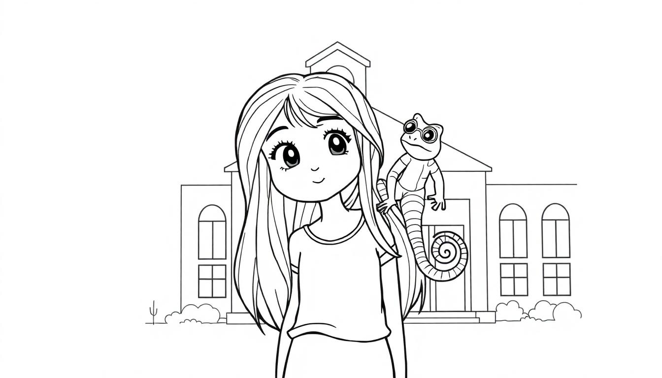Eine Schwarz-Weiß-Strichzeichnung einer niedlichen Ausmalseite für Kinder. Sie zeigt ein lächelndes junges Mädchen mit langen Haaren, das ein Chamäleon auf der Schulter trägt. Im Hintergrund ist ein charmantes Gebäude mit Spitzdach, das an ein Haus oder eine kleine Schule erinnert, zu sehen, umgeben von schematischen Büschen. Perfekt zum Ausmalen für kreative Köpfe!