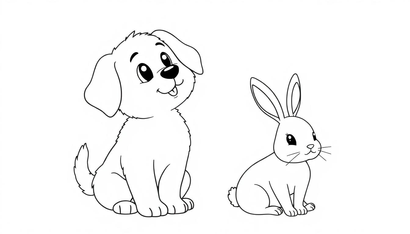 Diese bezaubernde Malvorlage, die einen treuen Hund und ein niedliches Kaninchen zeigt, ist mehr als nur ein Bild – sie ist eine Einladung zu kreativem Ausdruck und entspannenden Momenten. Die liebevoll gezeichneten Tiere im Cartoon-Stil sprechen sowohl kleine als auch große Künstler an. Der größere Hundewelpe mit seinen schläfrigen Schlappohren und der leicht herausgestreckten Zunge strahlt pure Lebensfreude aus, während das kleinere Kaninchen mit seinen aufgerichteten Ohren und feinen Schnurrhaaren eine ruhigere Präsenz vermittelt. Ihre Positionierung nebeneinander suggeriert eine freundschaftliche Verbindung, die beim Ausmalen weiter vertieft werden kann.
