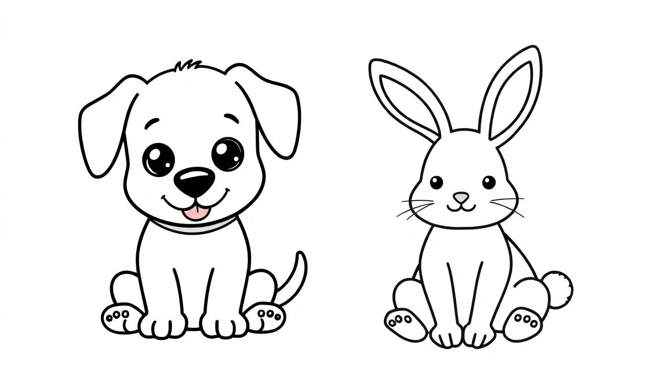 Dieses Bild ist eine Einladung an alle kleinen Künstler, ihrer Kreativität freien Lauf zu lassen. Im Zentrum stehen zwei klassische Lieblinge der Tierwelt: ein treuer Hund und ein flauschiges Kaninchen. Sie sind im einfachen, freundlichen Cartoon-Stil gezeichnet und warten darauf, mit Farben gefüllt zu werden. Der Hund auf der linken Seite lächelt mit seiner kleinen rosa Zunge, während das Kaninchen auf der rechten Seite mit seinen langen Ohren und dem sanften Ausdruck besticht. Beide sitzen nebeneinander, umgeben von der schlichten Eleganz eines weißen Hintergrunds, der den Fokus ganz auf die Tiere legt.