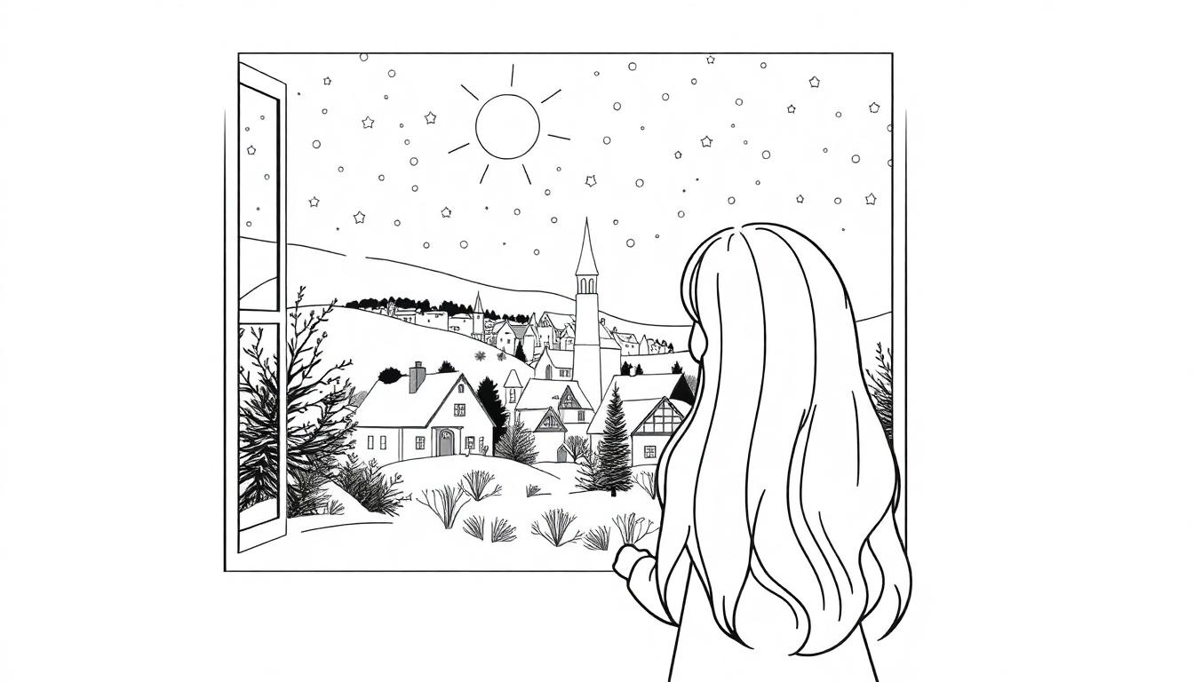 Eine detaillierte schwarz-weiße Ausmalseite, die eine friedliche Winterlandschaft zeigt. Ein Mädchen blickt von einem Fenster aus auf ein verschneites Dorf und schneebedeckte Hügel unter einem sternenklaren Himmel mit einer stilisierten Sonne. Perfekt für kreative Ausmaler.