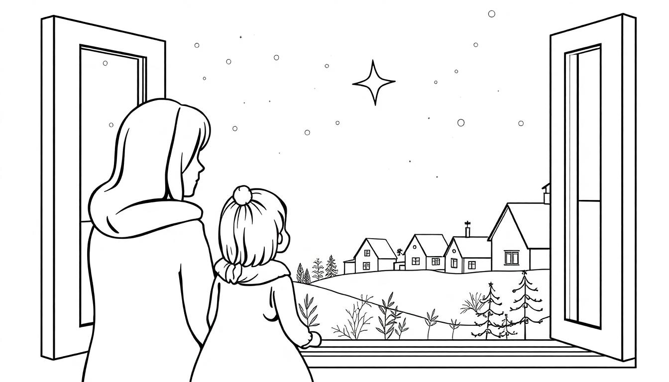 Dieses wunderschöne Ausmalbild entführt uns in eine friedliche Winterlandschaft, betrachtet durch die Wärme eines offenen Fensters. Im Vordergrund halten eine erwachsene Person und ein Kind inne, um gemeinsam die Magie der Nacht zu genießen. Ihre Silhouette, von hinten oder leicht von der Seite eingefangen, unterstreicht die Fokussierung auf das Draußen. Das lange, fließende Haar der Erwachsenen und der Dutt des Kindes verleihen ihnen eine weiche Kontur, während die Wärme des Innenraums durch die weite Öffnung des Fensters spürbar wird.