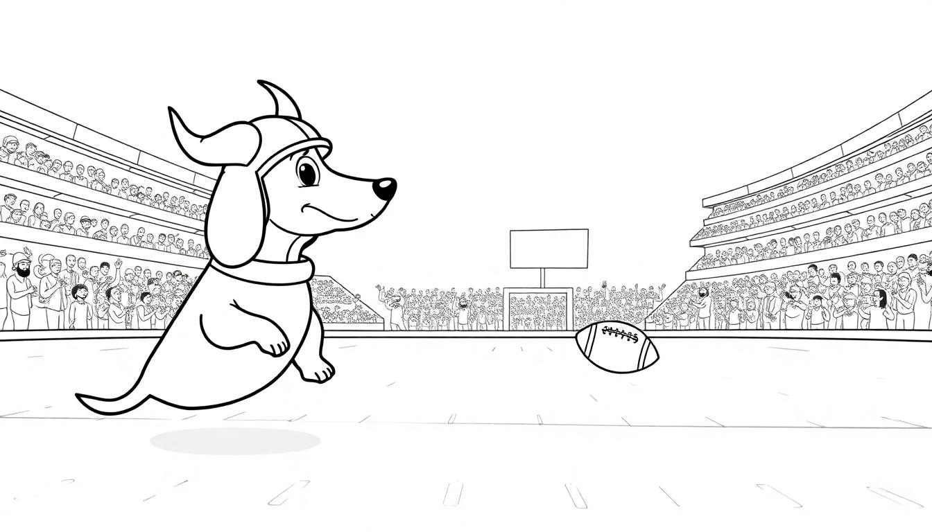 Eine Schwarz-Weiß-Ausmalvorlage mit einem freundlichen Hund im Wikingerhelm, einem Football auf dem Spielfeld und einem jubelnden Publikum in einem Stadion.
