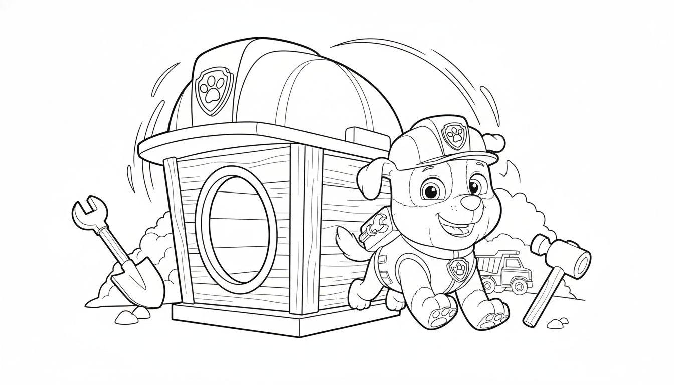 Eine schwarz-weiße Ausmalseite für Kinder, die einen vrolijken Hundewelpen zeigt. Er trägt einen gelben Bauhelm mit Pfotenabdruck und eine Weste mit Werkzeugsymbol, während er vor einem hölzernen Baustellenhäuschen mit Helm-Dach steht. Um ihn herum liegen Baugeräte wie Schaufel, Schraubenschlüssel, Hammer und ein Kipplaster im Hintergrund. Ideal, um Kreativität und Interesse an Bauarbeiten zu fördern.