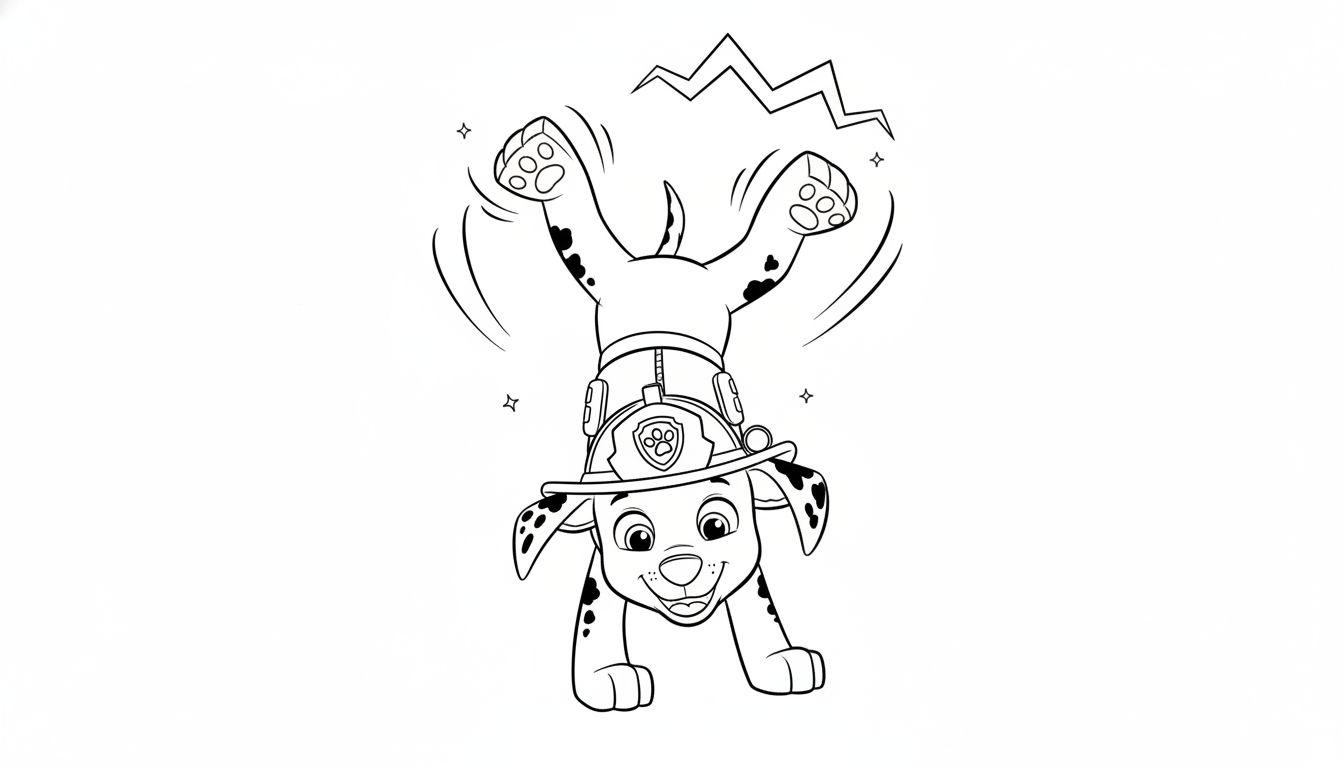 Eine Schwarz-Weiß-Malvorlage zeigt Marshall, den beliebten Dalmatiner-Feuerwehrhund aus Paw Patrol, in einer dynamischen Pose. Er macht scheinbar einen Handstand oder Sprung, mit seinen Hinterbeinen und dem Schwanz fröhlich in die Luft gestreckt. Marshall trägt seinen charakteristischen Feuerwehrhelm und hat ein breites, lachendes Grinsen im Gesicht. Sein Körper ist mit den typischen Dalmatinerflecken versehen. Um ihn herum deuten geschwungene Linien und Sterne Bewegung und Energie an, während eine Zickzacklinie über seinem Rücken weitere Dynamik hinzufügt. Der Hintergrund ist schlicht weiß. Ideal zum Ausmalen für Kinder und Fans von Paw Patrol.