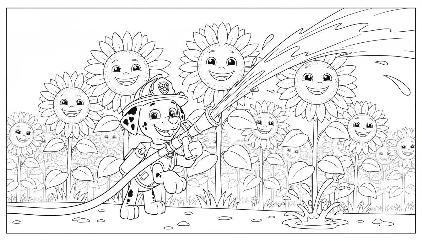 Marshall Paw Patrol Ausmalbild: Fröhlicher Feuerwehrhund bewässert lachende Sonnenblumen