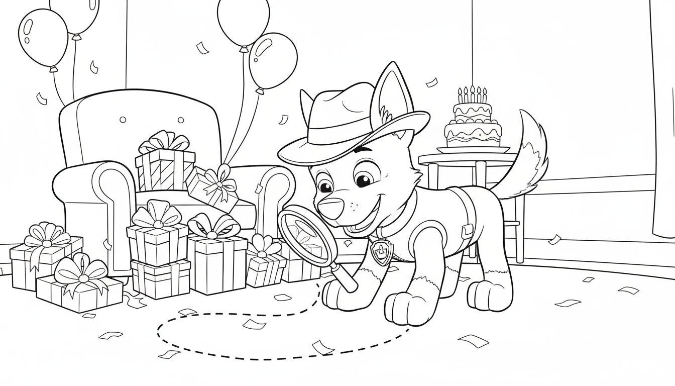 Willkommen zu einer aufregenden Geburtstagsparty, bei der Chase von Paw Patrol die Hauptrolle spielt – allerdings nicht in seiner üblichen Polizeiausrüstung, sondern als charmanter Detektiv! Dieses einzigartige Ausmalbild lädt Kinder dazu ein, in eine Welt voller Rätsel und Feierlichkeiten einzutauchen. Mit seinem Detektivhut und dem Vergrößerungsglas in der Pfote folgt Chase einer geheimnisvollen Stippellinie, die die Fantasie beflügelt: Welches Geheimnis gilt es zu lüften? Und wer hat die Spur gelegt?