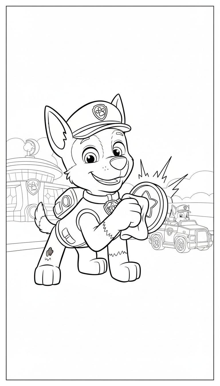 Diese spannende Malvorlage bringt den beliebten Polizeihund Chase aus der Animationsserie Paw Patrol direkt in die Kinderzimmer. Im Mittelpunkt des Bildes steht Chase, ein freundlicher Deutscher Schäferhund, der seine ikonische Polizeimütze und sein passendes Uniform-Vest trägt. Besonders auffällig ist das runde, schildartige Objekt mit einem leuchtenden Stern in der Mitte, das er mit seinen Vorderpfoten hält. Die stilisierten Streifen, die von diesem Objekt ausgehen, deuten darauf hin, dass er gerade eine besondere Fähigkeit aktiviert oder ein nützliches Gadget für seine Mission einsetzt. Dies lädt kleine Künstler dazu ein, ihrer Fantasie freien Lauf zu lassen und sich vorzustellen, welche spannende Rettungsaktion Chase als Nächstes bevorsteht.